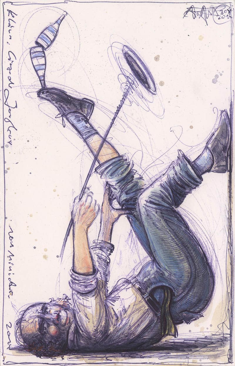Kleiner, liegender Jongleur18. Juli 2015 Kugelschreiber, Farbstift, Aquarell, KaffeeWvz. 4978Format: 250 x 165 mmOktober 2014 Vorheriger BeitragProstNächster BeitragDer kleine Strich, am Ende der Straße