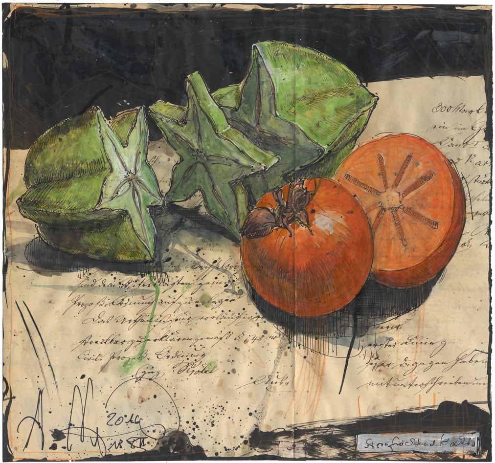 Sternfrucht und Kaki16. Dezember 201616. Dezember 2016 Federzeichnung, Farbstift, AquarellWvz. 5049Format: 330 x 350 mmDezember 2016 Vorheriger BeitragArtischocke und lange ZwiebeleiNächster BeitragTrauben im Dunkel