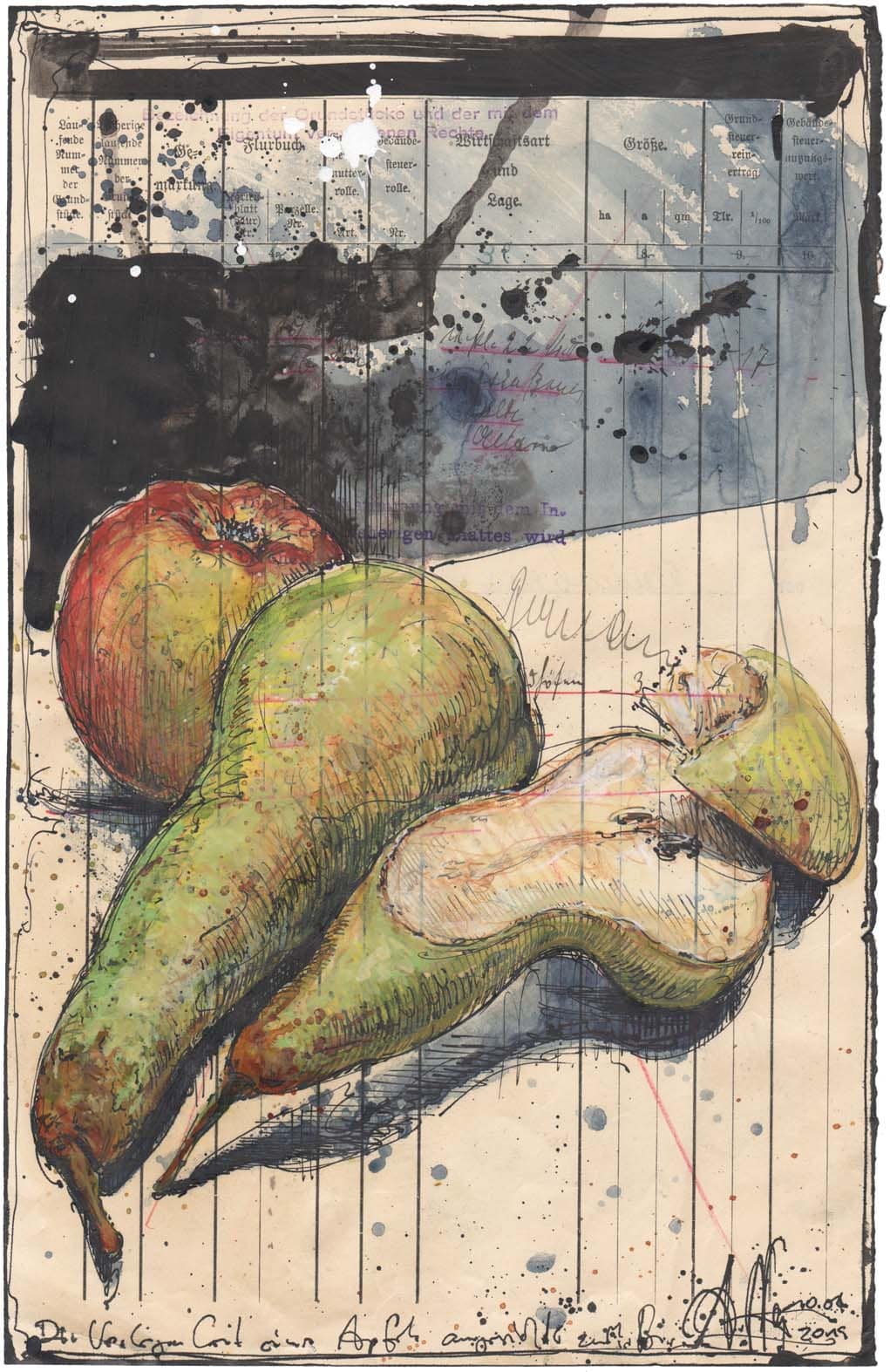 Die Verlegenheit eines Apfels angesichts zweier Birnen11. April 201911. April 2019 Federzeichnung, Farbstift, AquarellWvz. 5147Format: 330 x 210 mmApril 2019 Vorheriger BeitragMartins TröpfchenNächster BeitragDer Duft von Lauchzwiebeln am Morgen