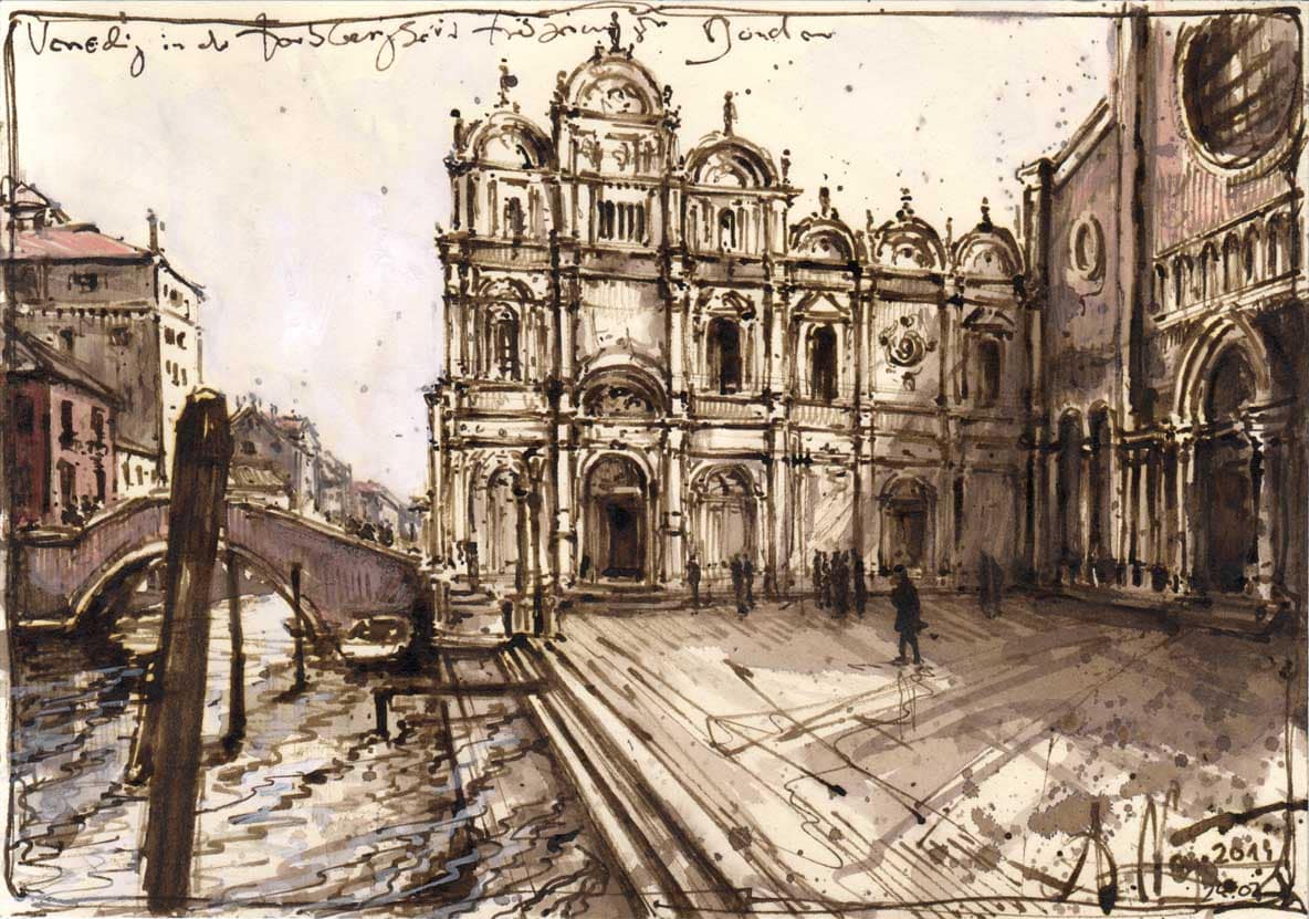 Venedig in der Farblosigkeit trübsinniger Stunden27. März 201927. März 2019 Rohrfederzeichnung, Sepia, Aquarell, Farbstift175 x 250 mmDvz. 114024.03.2019 Vorheriger BeitragEin wahrlich langer TagNächster BeitragSo weit das Grün