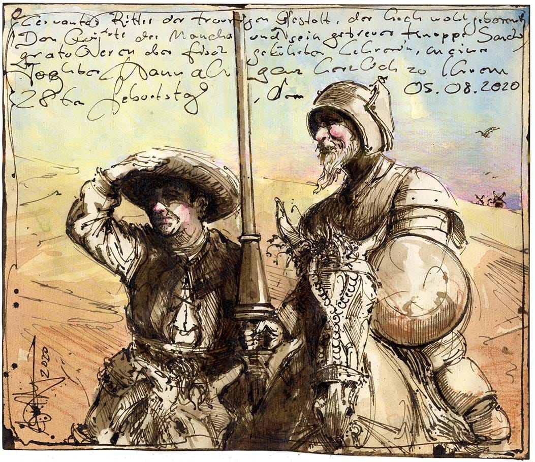 Cervantes Ritter der traurigen Gestalt und Sancho Panza23. Juli 202023. Juli 2020 Federzeichnung, Farbstift, Aquarell190 x 220 mmDvz. 137223.07.2020 Vorheriger BeitragRathaus MünchenNächster BeitragDon Quijote von der Mancha