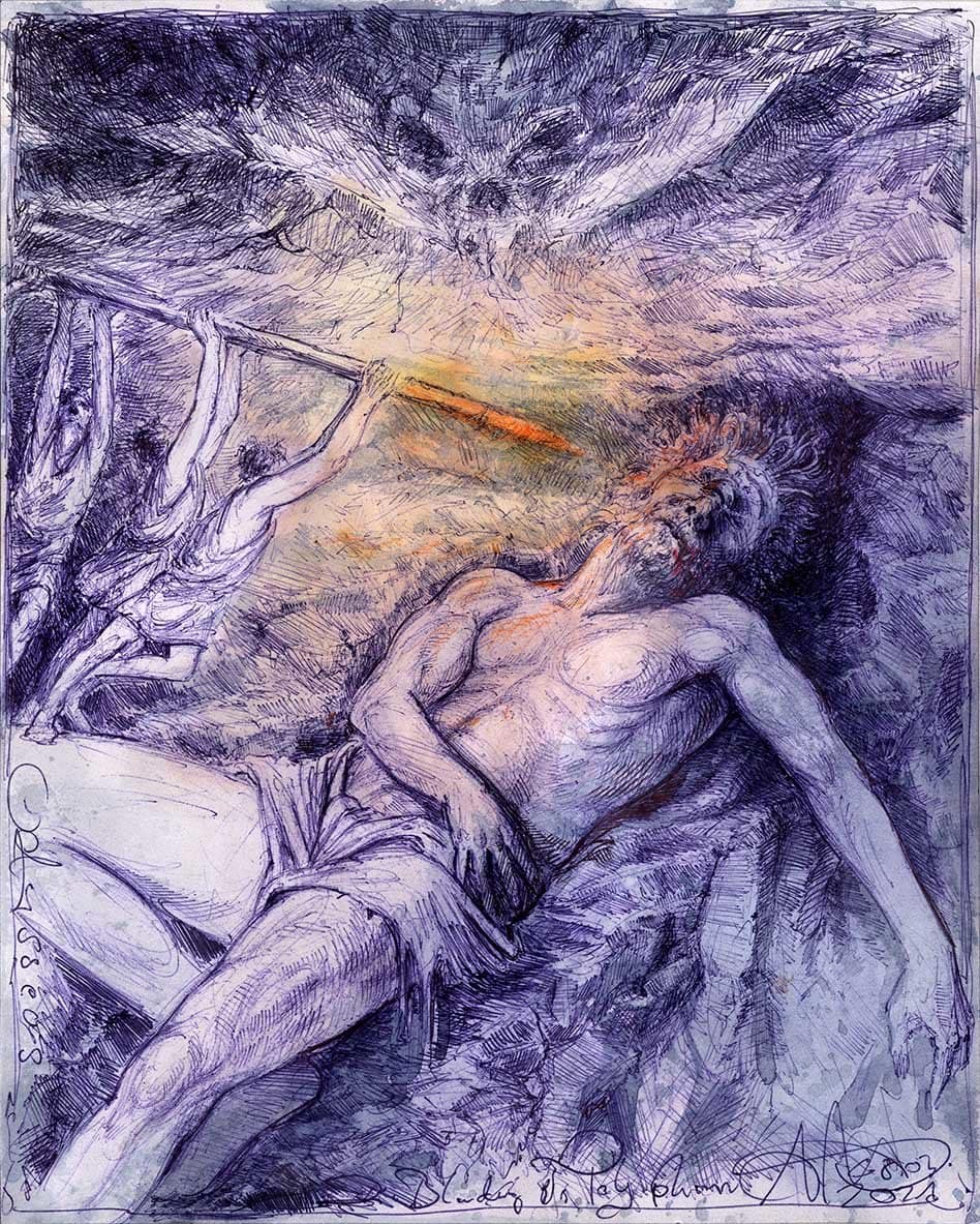 Odysseus – Die Blendung des Polyphem8. März 20213. Juni 2024 Kugelschreiber, Farbstift, AquarellDvz. 1457Format: 250 x 198 mm08.03.2021 Vorheriger BeitragHesiodNächster BeitragMedusa