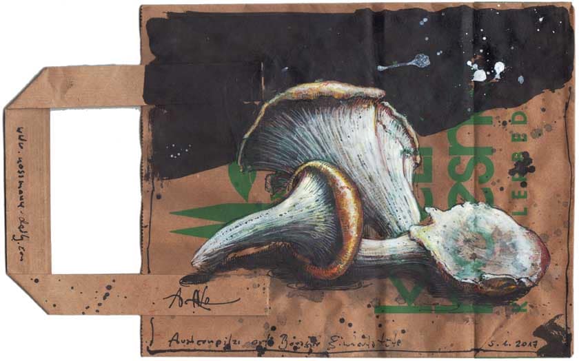 Austernpilze auf Boesner Einkaufstüte24. August 201729. August 2017 Federzeichnung, Farbstift, Aquarell180 x 220 mmDvz. 54405.01.2017 Vorheriger BeitragWirsing … oder auch ein Kohl fühlt sich wohlNächster BeitragKohlrabi