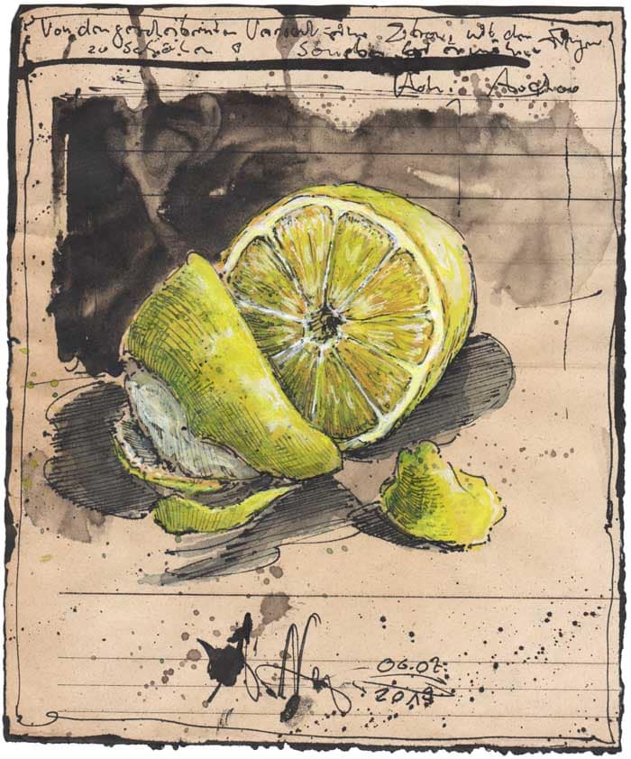 Von dem gescheiterten Versuch eine Zitrone mit den Fingern zu schälen24. August 201724. August 2017 Federzeichnung, Farbstift, Aquarell210 x 175 mmDvz. 67806.07.2017 Vorheriger BeitragDes Magistrats über sich hinauswachsende ZwiebeleiNächster BeitragMalve