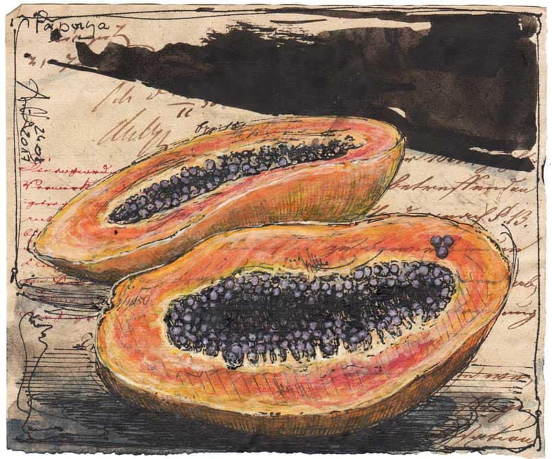 Papaya25. August 201725. August 2017 Federzeichnung, Farbstift, Aquarell165 x 200 mmDvz. 72324.08.2017 Vorheriger BeitragDie große AdmiralitätNächster BeitragTod in Venedig III.