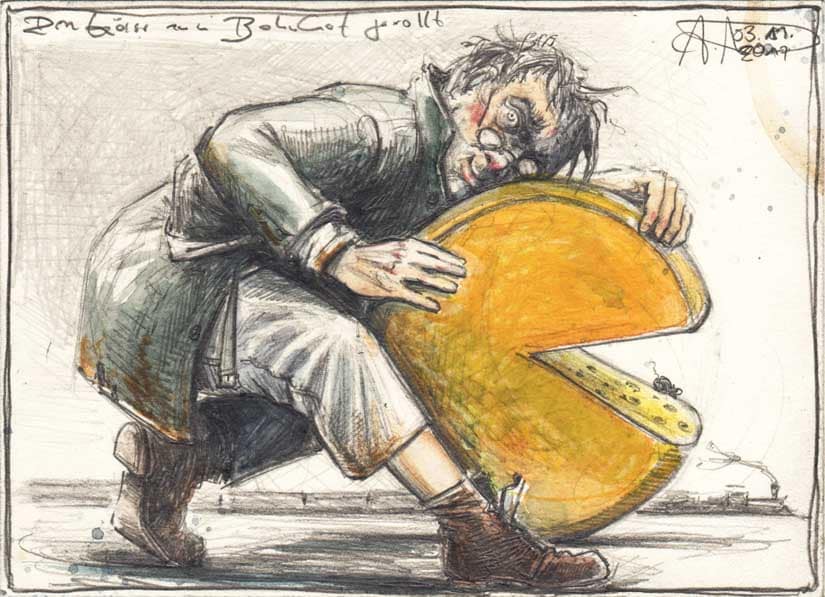 Den Käse zum Bahnhof gerollt4. November 20174. November 2017 Bleistift, Farbstift, Aquarell175 x 125 mmDvz. 76003.11.2017 Vorheriger BeitragDer Drei-Käse-hochNächster BeitragFrau in Schwarz