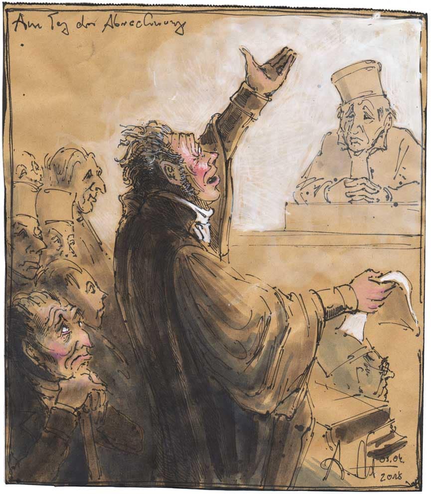 Tag der Abrechnung13. April 201813. April 2018 Federzeichnung, Farbstift, Aquarell245 x 215 mmDvz. 88405.04.2018 Vorheriger BeitragIm sich verlaufenden IrgendwoNächster BeitragÄhh, wir war das gleich nochmal