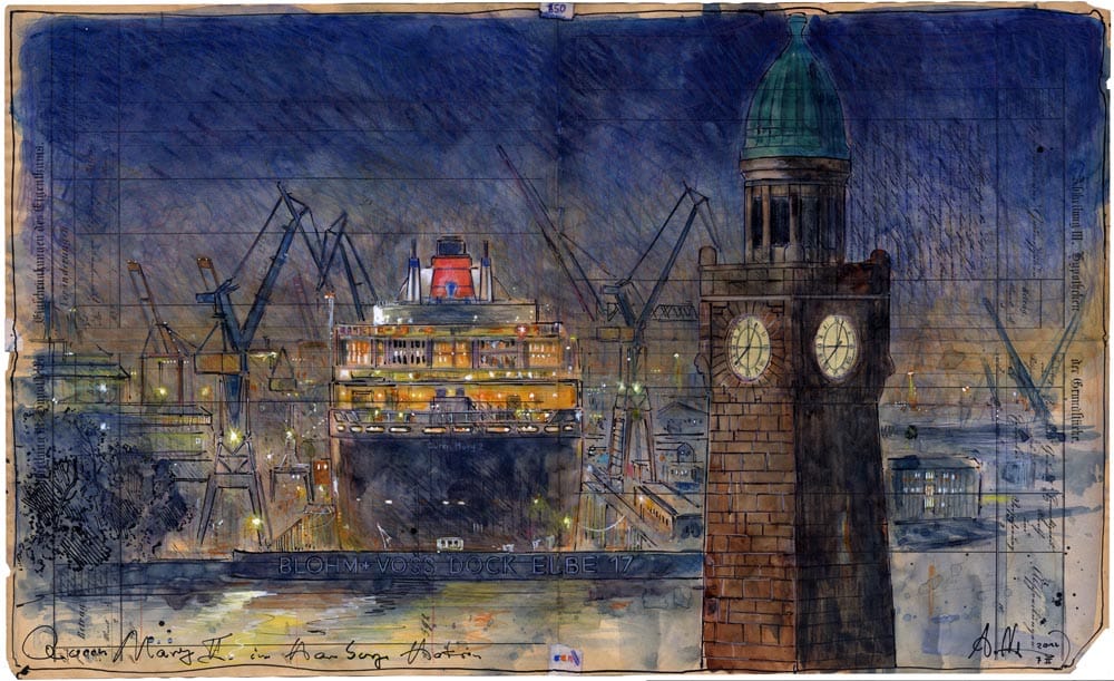 Federzeichnung, Farbstift, Aquarell, Tusche, Collage