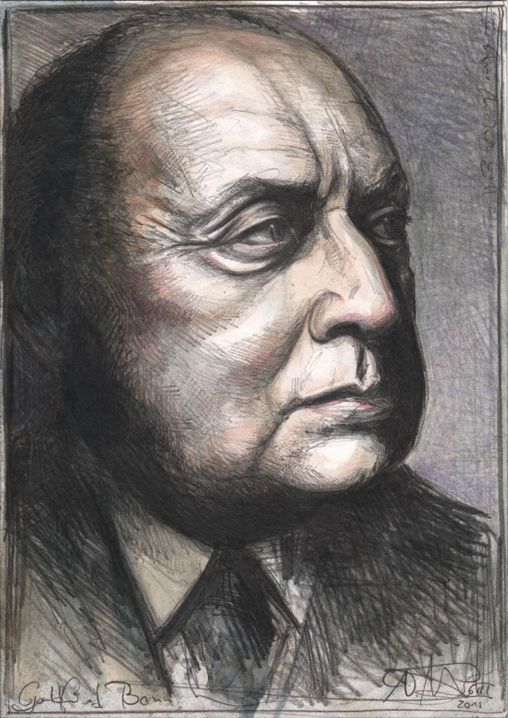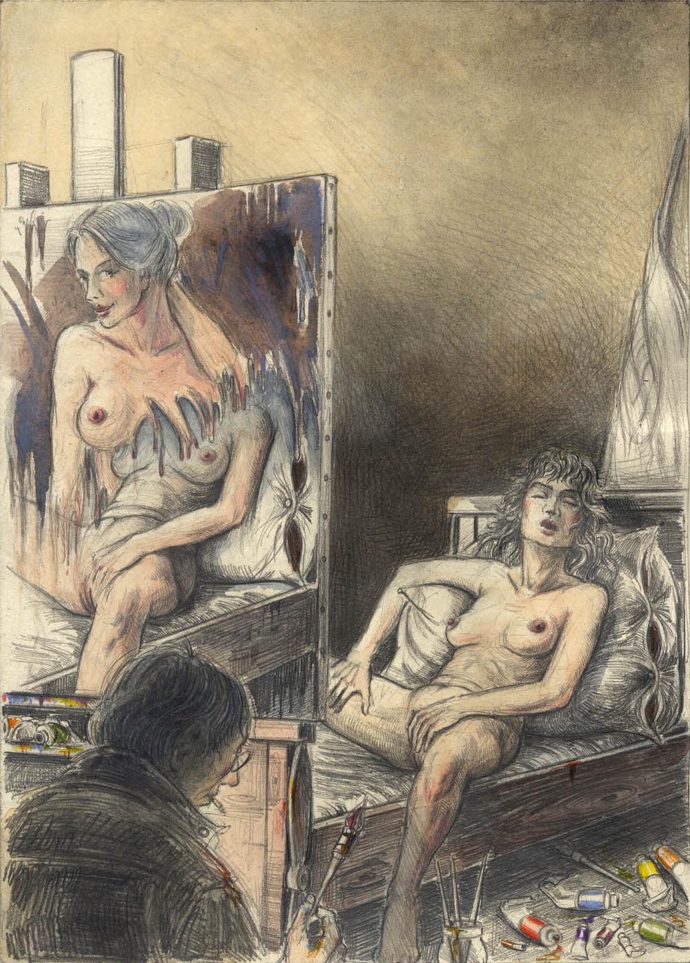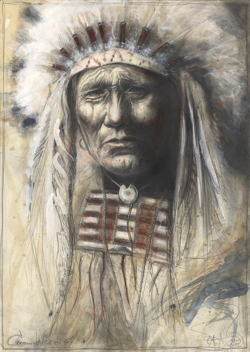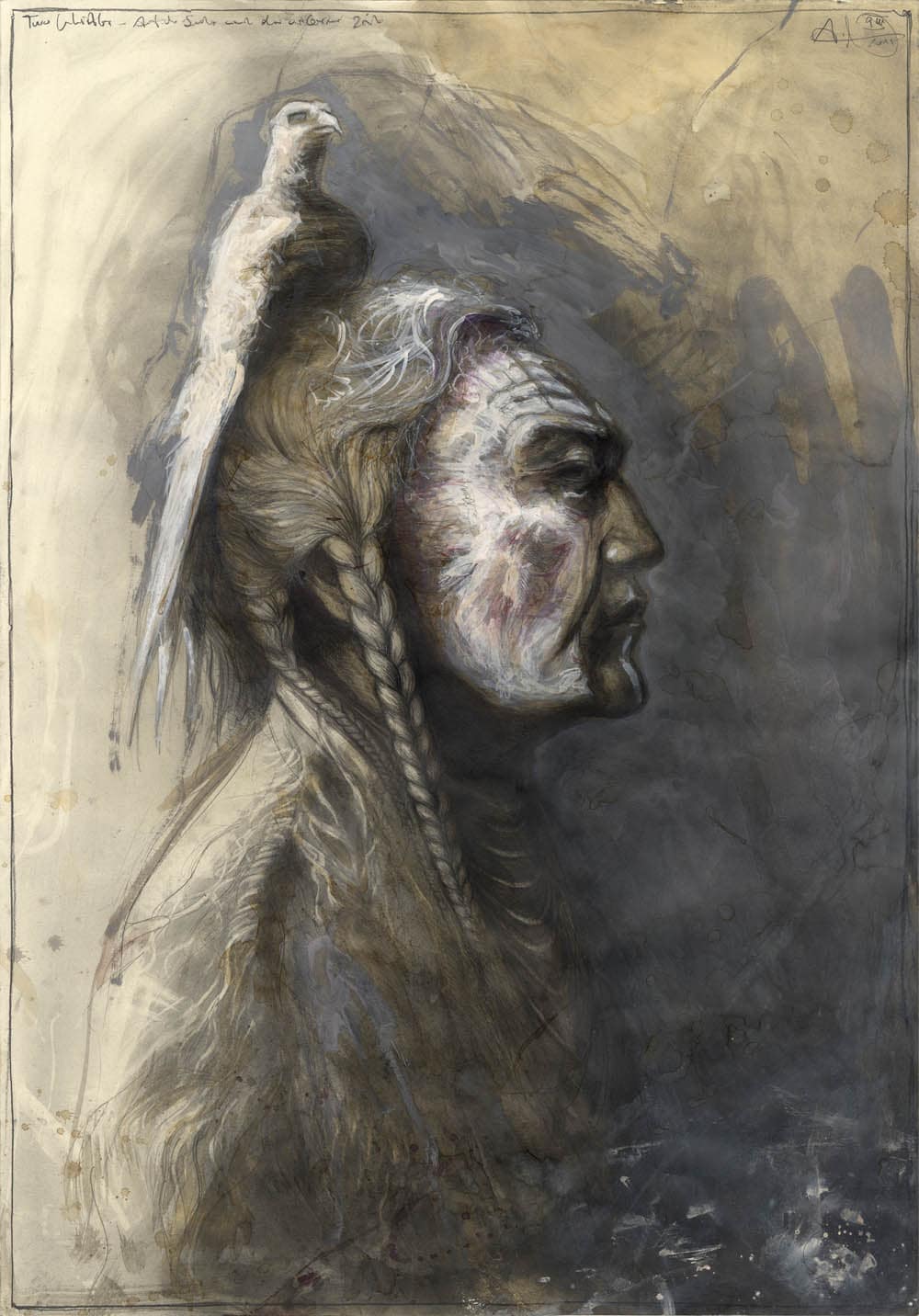 Bleistift, Farbstift, Kaffee, Pastell, weiße Tusche