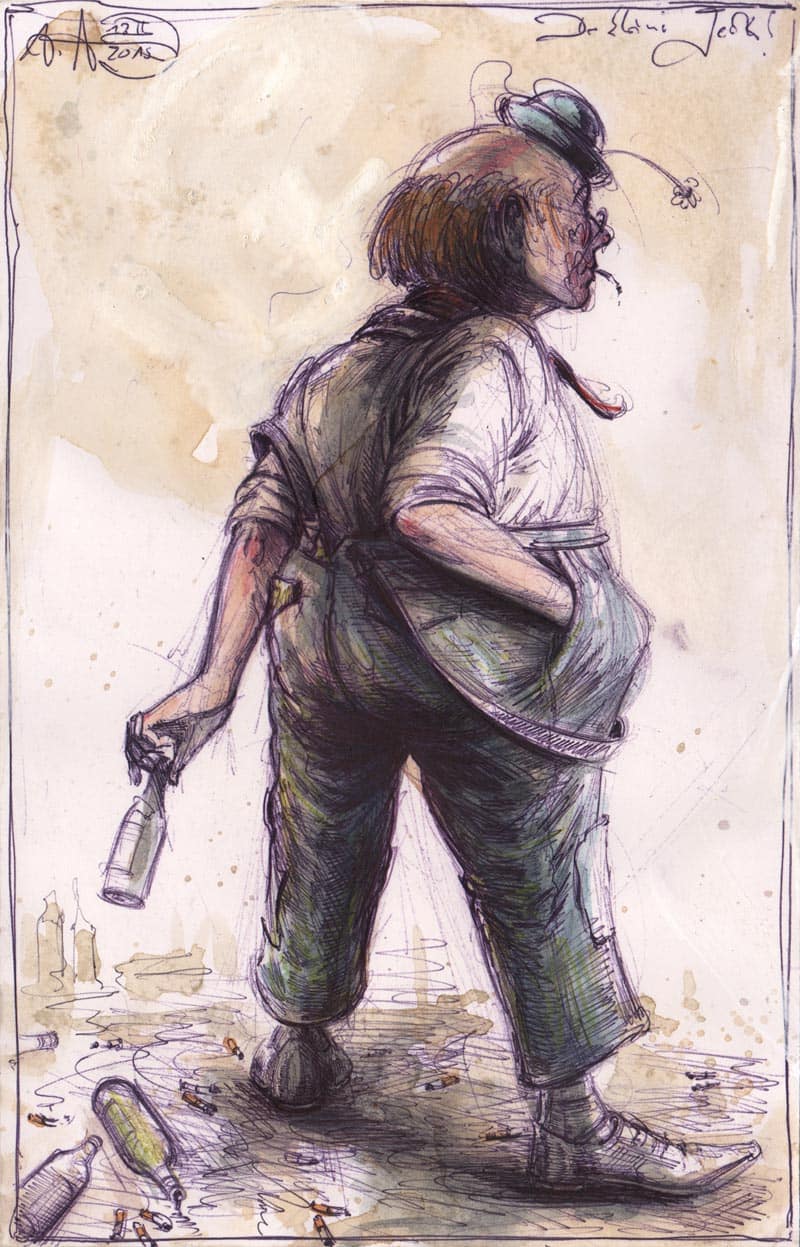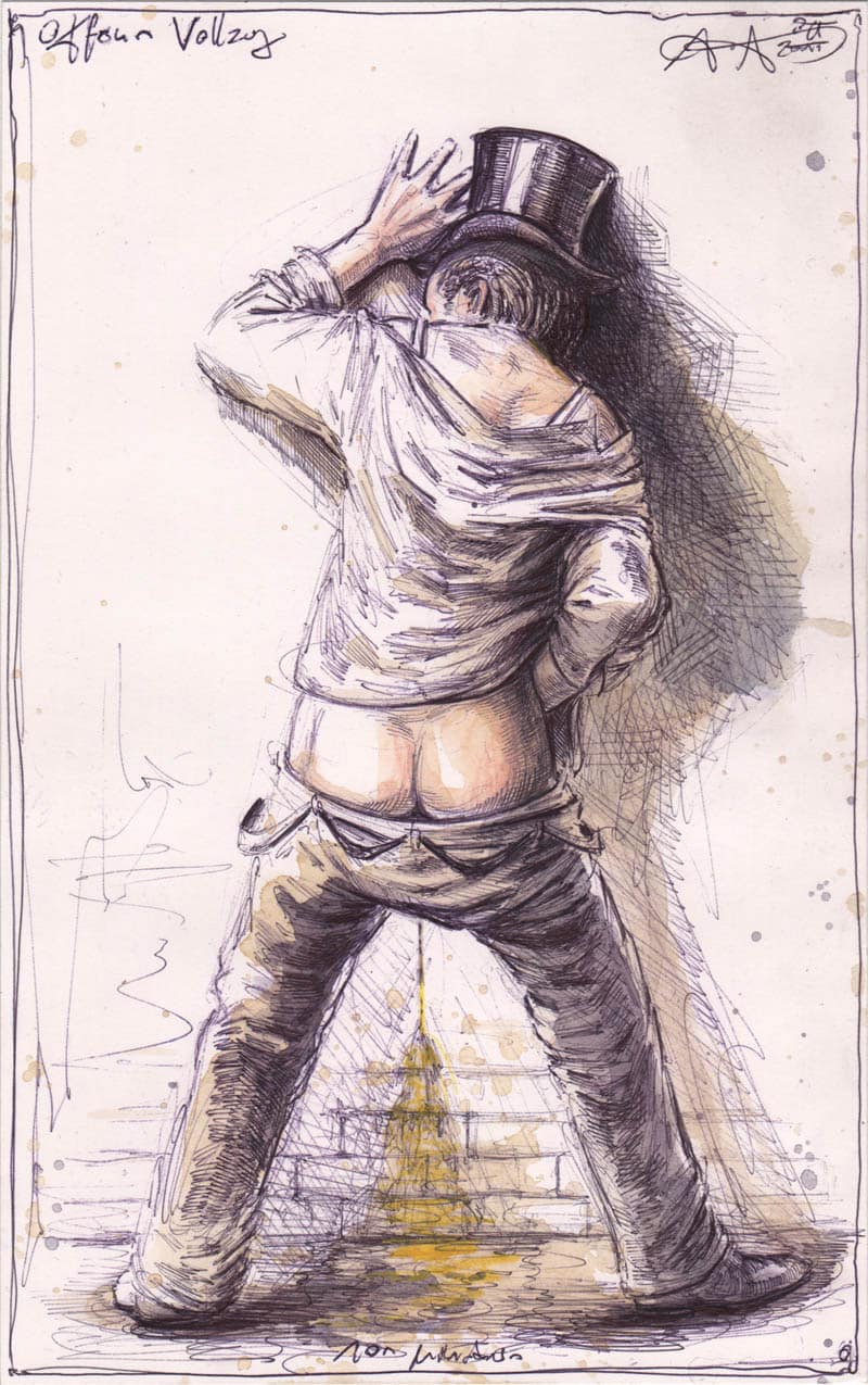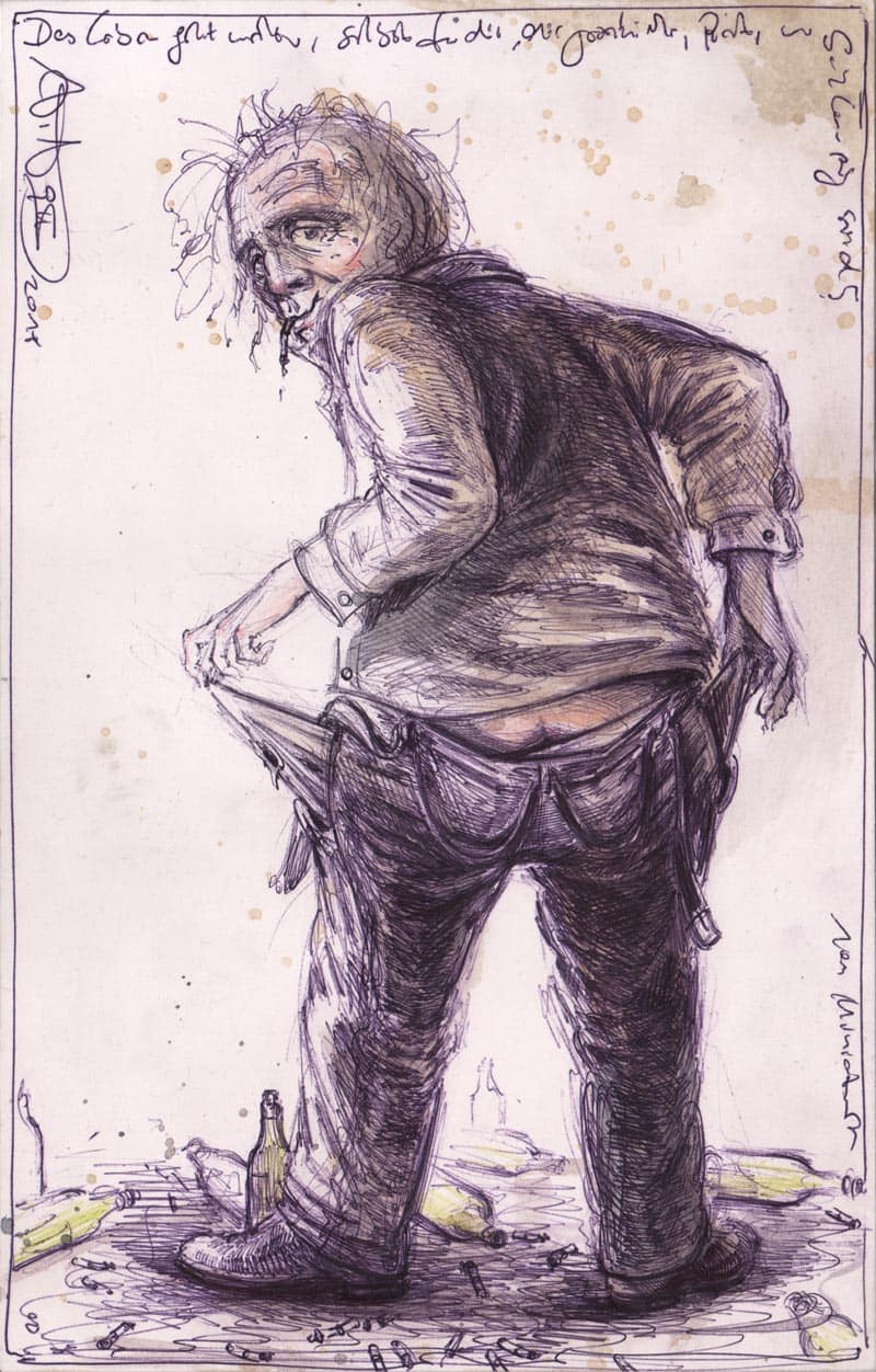 Kugelschreiber, Farbstift, Aquarell, Kaffee