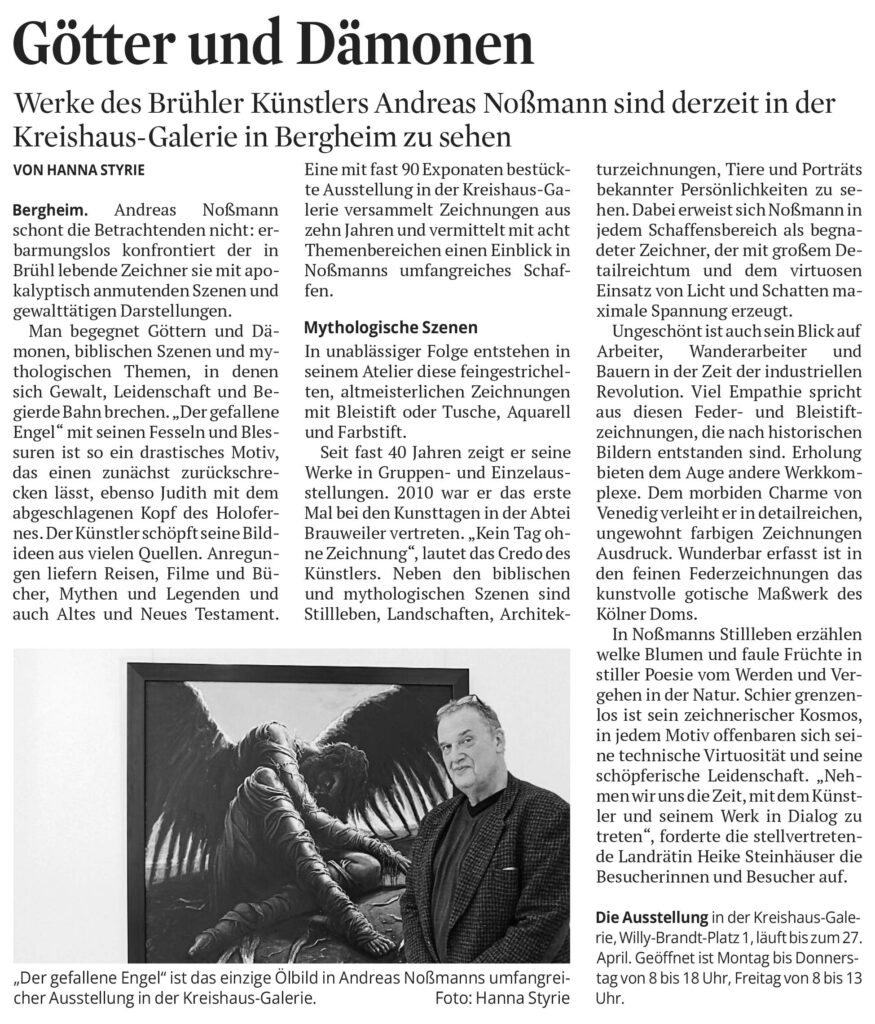 Bergheim. Andreas Noßmann schont die Betrachtenden nicht: erbarmungslos konfrontiert der in Brühl lebende Zeichner sie mit apokalyptisch anmutenden Szenen und gewalttätigen Darstellungen. Man begegnet Göttern und Dämonen, biblischen Szenen und mythologischen Themen, in denen sich Gewalt, Leidenschaft und Begierde Bahn brechen. „Der gefallene Engel“ mit seinen Fesseln und Blessuren ist so ein drastisches Motiv, das einen zunächst zurückschrecken lässt, ebenso Judith mit dem abgeschlagenen Kopf des Holofernes. Der Künstler schöpft seine Bildideen aus vielen Quellen. Anregun gen liefern Reisen, Filme und Bücher, Mythen und Legenden und auch Altes und Neues Testament. Eine mit fast 90 Exponaten bestückte Ausstellung in der Kreishaus-Galerie versammelt Zeichnungen aus zehn Jahren und vermittelt mit acht Themenbereichen einen Einblick in Noßmanns umfangreiches Schaffen. Mythologische Szenen