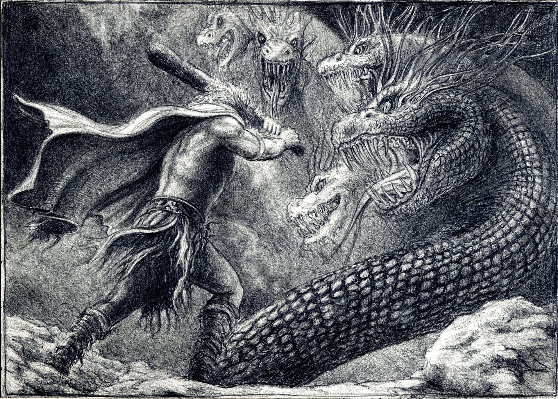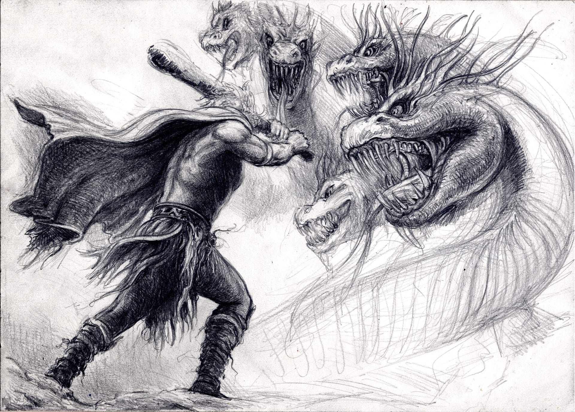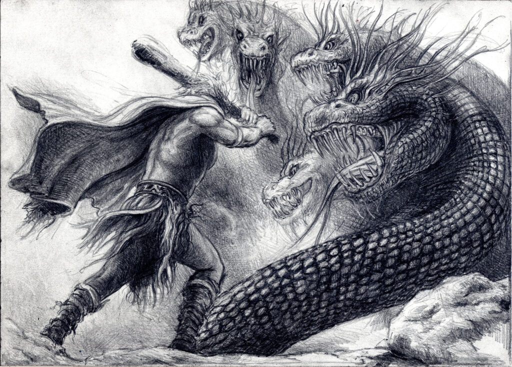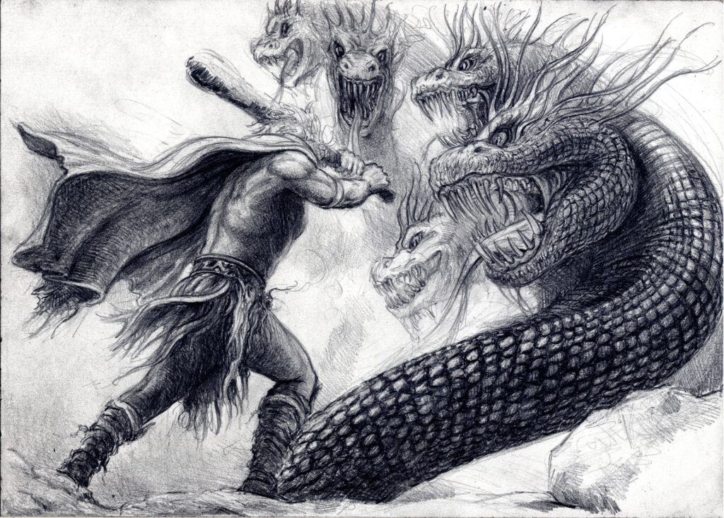 Als sie die Hydra fanden, erhob sie sich zischend aus dem Morast. Herakles stürzte sich in den Kampf, schlug einen Kopf ab – und sah entsetzt, wie zwei neue nachwuchsen. Die Hydra lachte höhnisch, ihre Augen glühten wie Kohlen. Da rief Iolaos: „Wir müssen die Wunden versengen, bevor neue Köpfe wachsen!“ Und so geschah es: Während Herakles kämpfte, stand Iolaos bereit mit brennenden Fackeln. Jeder abgeschlagene Kopf wurde sofort verbrannt – und so konnte die Hydra sich nicht mehr regenerieren.