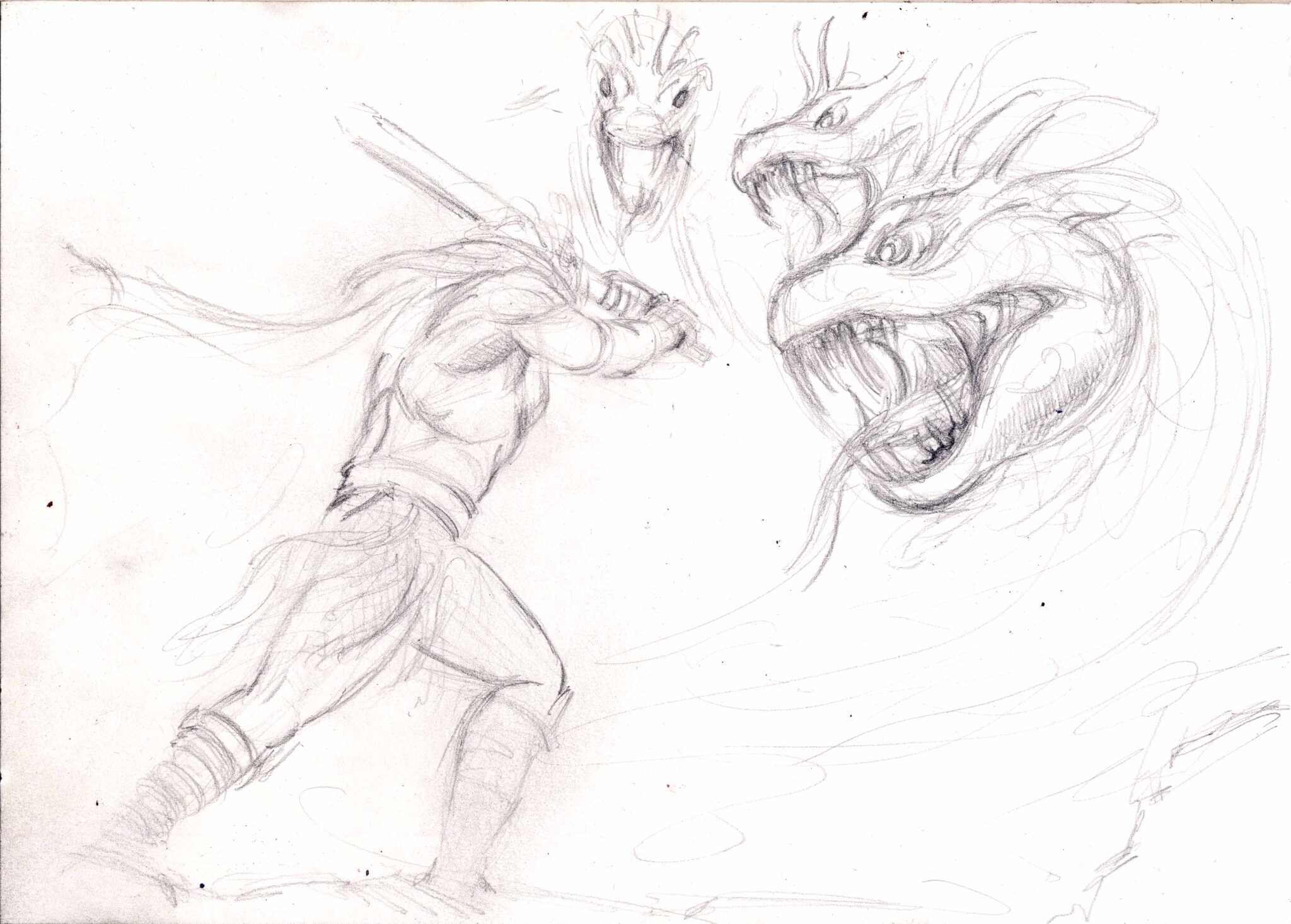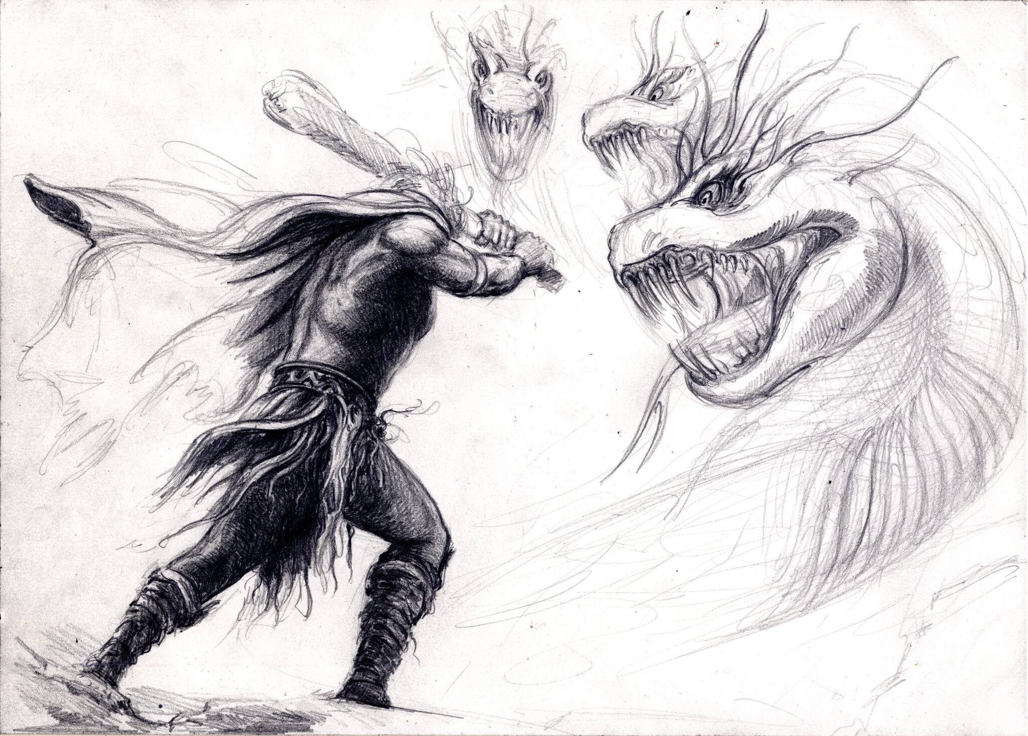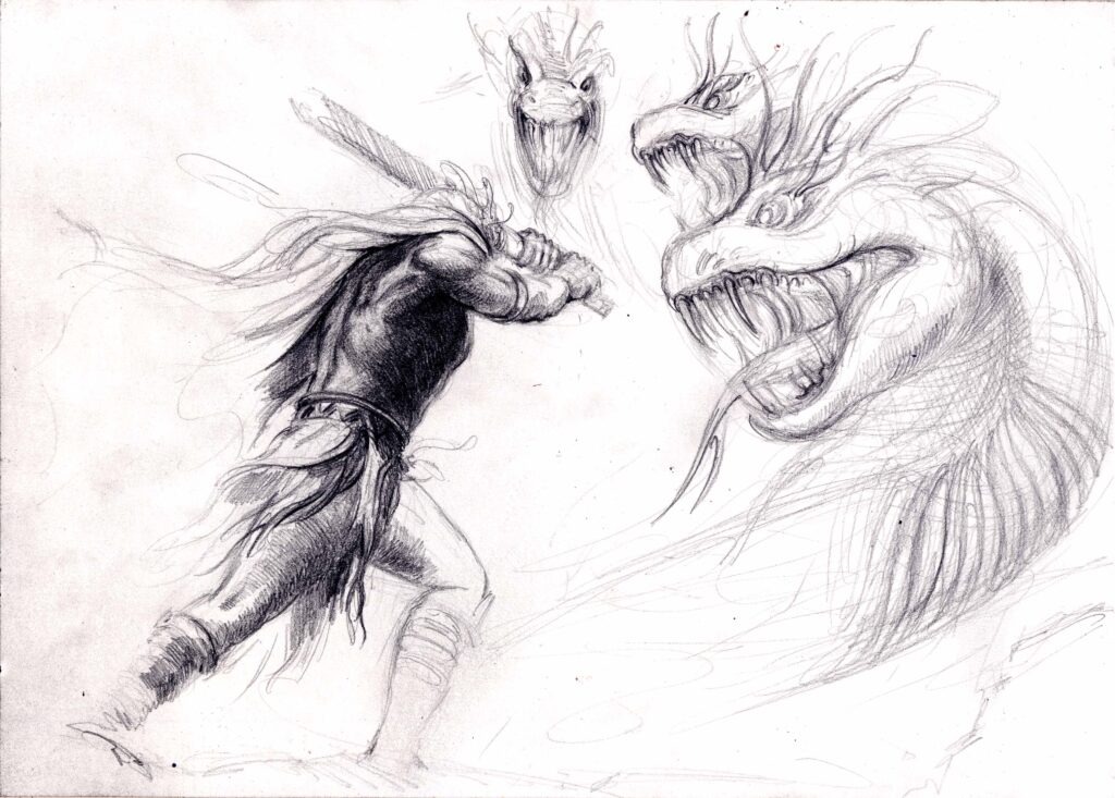 Als sie die Hydra fanden, erhob sie sich zischend aus dem Morast. Herakles stürzte sich in den Kampf, schlug einen Kopf ab – und sah entsetzt, wie zwei neue nachwuchsen. Die Hydra lachte höhnisch, ihre Augen glühten wie Kohlen. Da rief Iolaos: „Wir müssen die Wunden versengen, bevor neue Köpfe wachsen!“ Und so geschah es: Während Herakles kämpfte, stand Iolaos bereit mit brennenden Fackeln. Jeder abgeschlagene Kopf wurde sofort verbrannt – und so konnte die Hydra sich nicht mehr regenerieren.