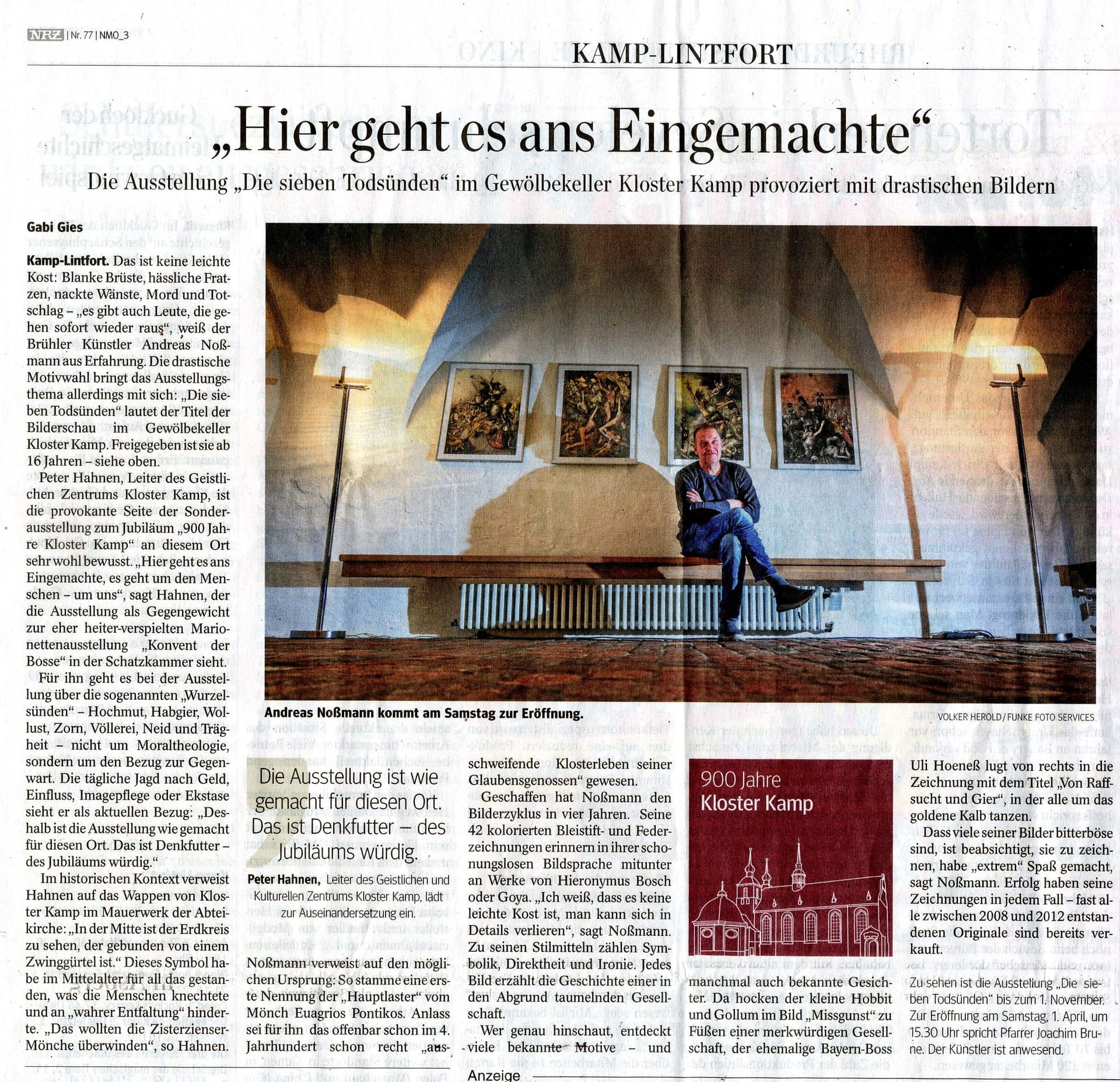 Für ihn geht es bei der Ausstellung über die sogenannten „Wurzelsünden“ – Hochmut, Habgier, Wollust, Zorn, Völlerei, Neid und Trägheit – nicht um Moraltheologie, sondern um den Bezug zur Gegenwart: Die tägliche Jagd nach Geld, Einfluss, Imagepflege oder Ekstase sieht er als aktuellen Bezug: „Deshalb ist die Ausstellung wie gemacht für diesen Ort. Das ist Denkfutter – des Jubiläums würdig.“ Im historischen Kontext verweist Hahnen auf das Wappen von Kloster Kamp im Mauerwerk der Abteikirche: „In der Mitte ist der Erdkreis zu sehen, der gebunden von einem Zwinggürtel ist.“ Dieses Symbol habe im Mittelalter für all das gestanden, was die Menschen knechtete und an „wahrer Entfaltung“ hinderte. „Das wollten die Zisterzienser-Mönche überwinden“, so Hahnen.