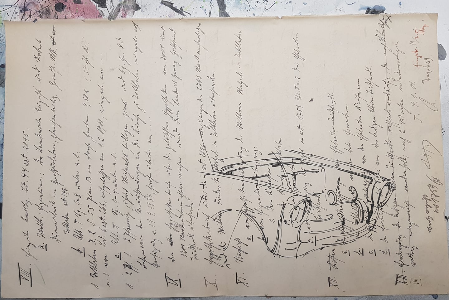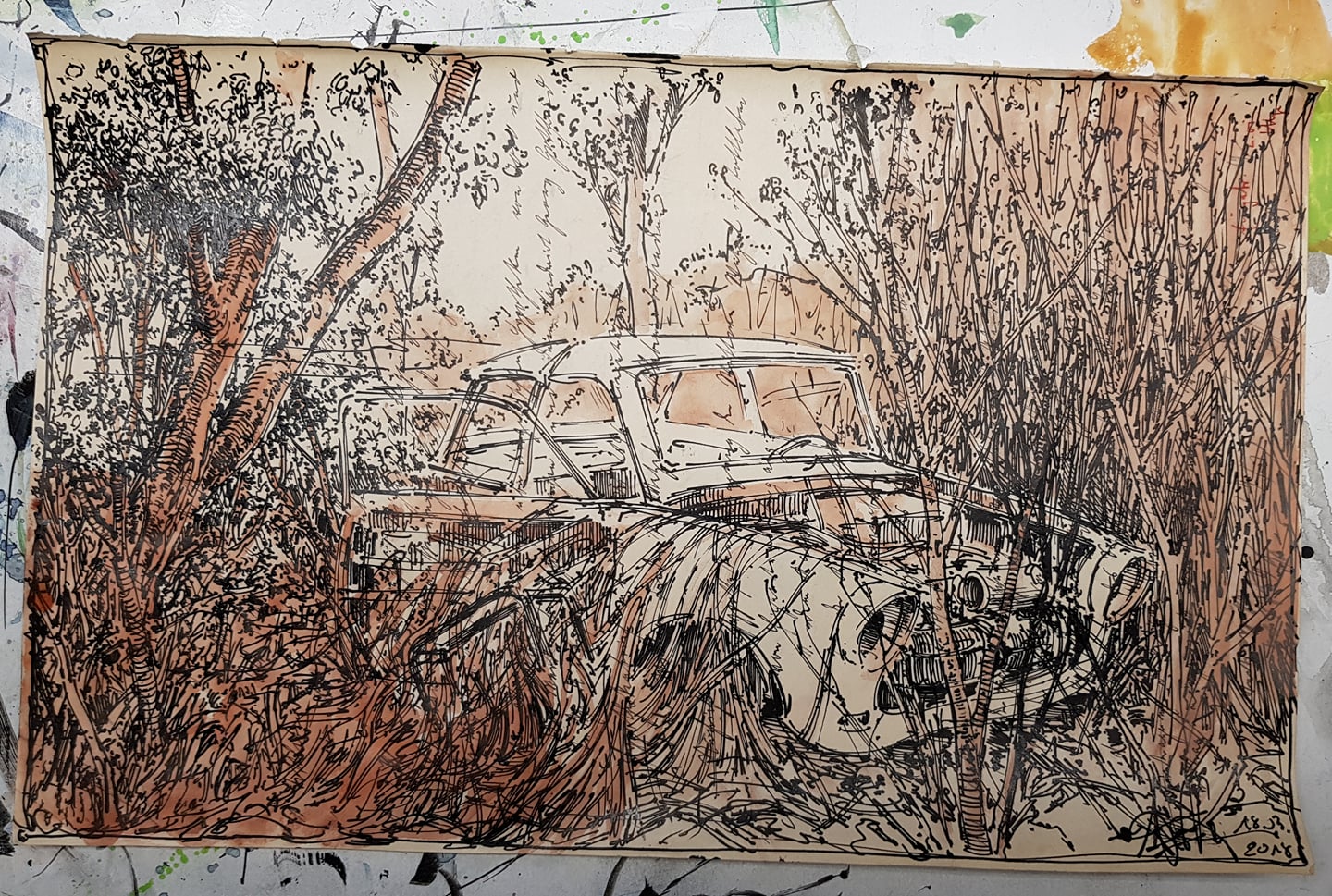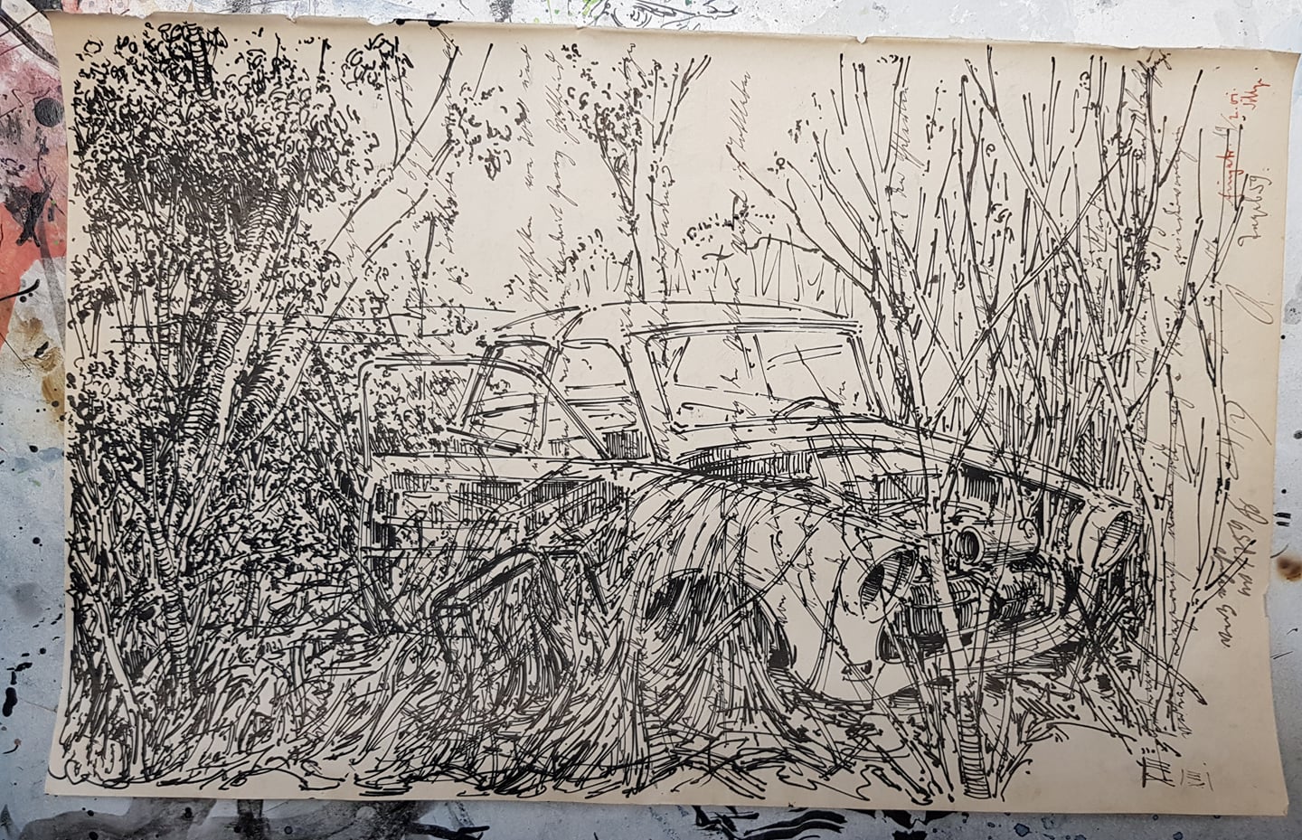 Federzeichnung, Farbstift, Aquarell