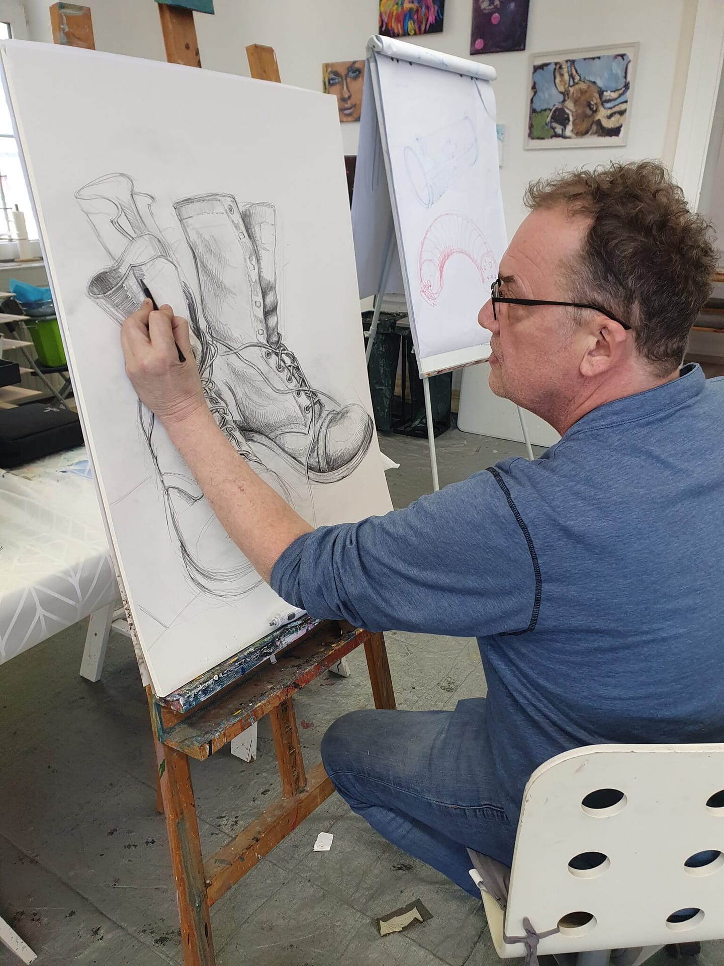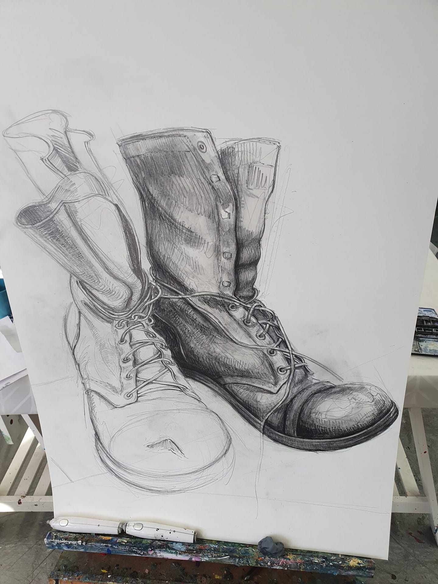 Dieses „Schuhwerk“ begann ich als Vorführaktion im letzten Seminar „Stillleben – Die Schönheit des Objektes“, im Weißen Haus – Hattingen, um all den Teilnehmern zu verdeutlichen, wie man solch ein Motiv überhaupt erst beginnt und wieviel Aufwand es Bedarf, zu einem zufriedenstellenden Anfang zu kommen. Vor allem in diesem großem Format.