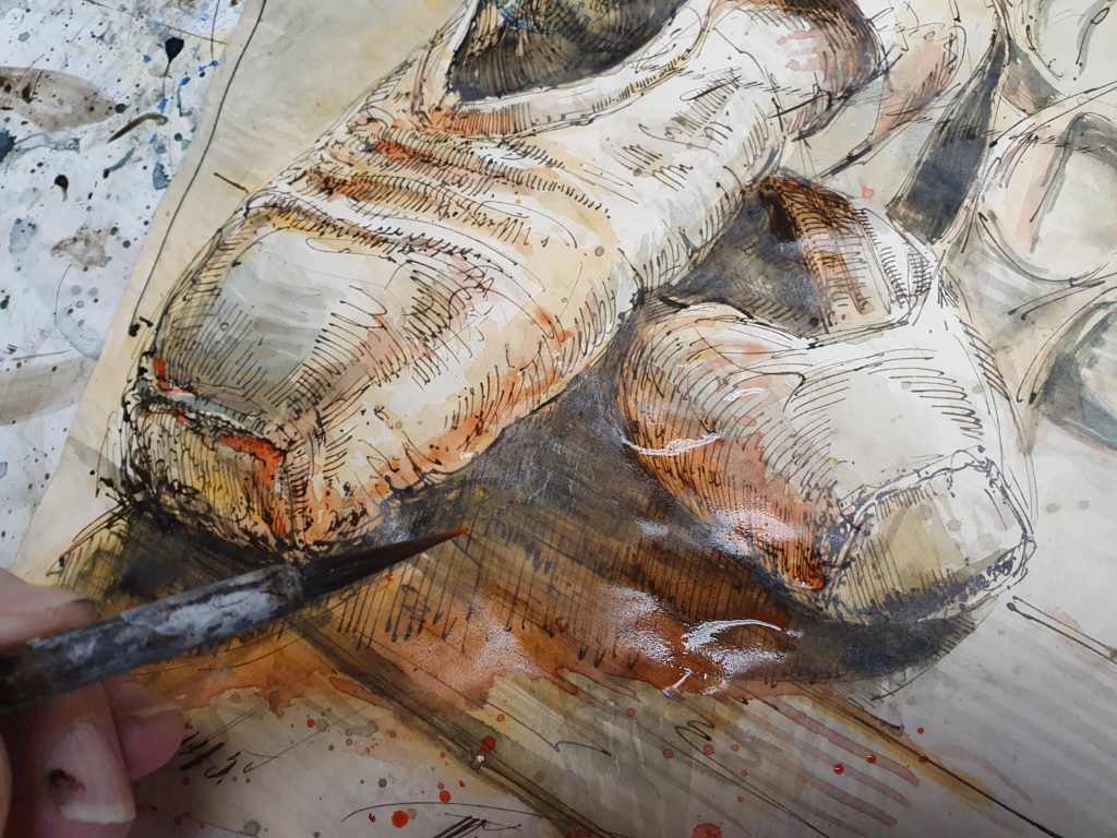 Ein bisschen so hat sich auch diesem neuen Blatt verhalten. Erst als lichtes, als helle Zeichnung angedacht, durchwanderte diese mehre Prozesse des Zeichnens, des Aquarellierens, um am Ende eher den Moment der verlassenen Ballettschuhe nach dem Auftritt der Odile widerzugeben, jenem Umstand geschuldet, in dem das Licht der Dunkelheit weichen musste.