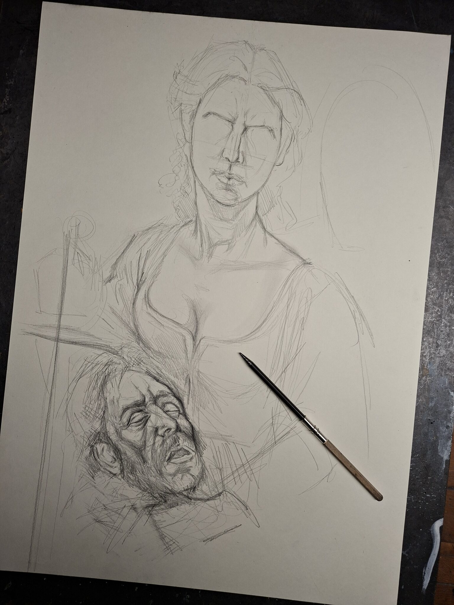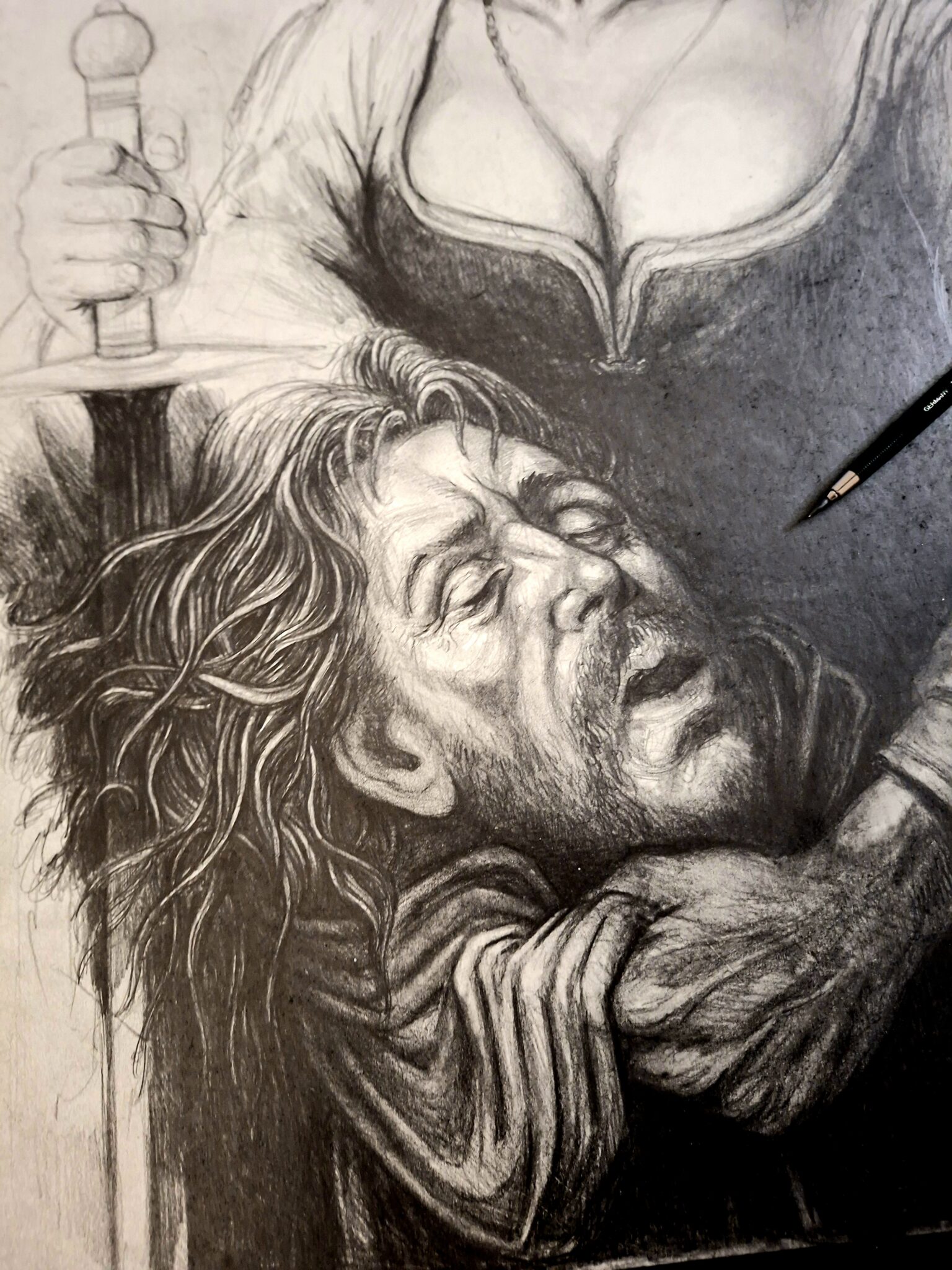Rein formal wollte ich eigentlich am Ende ein anderes Ergebnis – aber manchmal kommt es — während der tagelangen Entwicklung einer solchen Zeichnung – dann doch mal anders, weil es sich einem förmlich aufdrängt von der ursprünglichen Idee doch besser abzuweichen. Diese Zeichnung ist fast schon Malerei geworden – nur mit Bleistift und ein wenig Farbe. Dieses doch recht klassische Motiv hat mich im Grunde geradezu dazu genötigt!