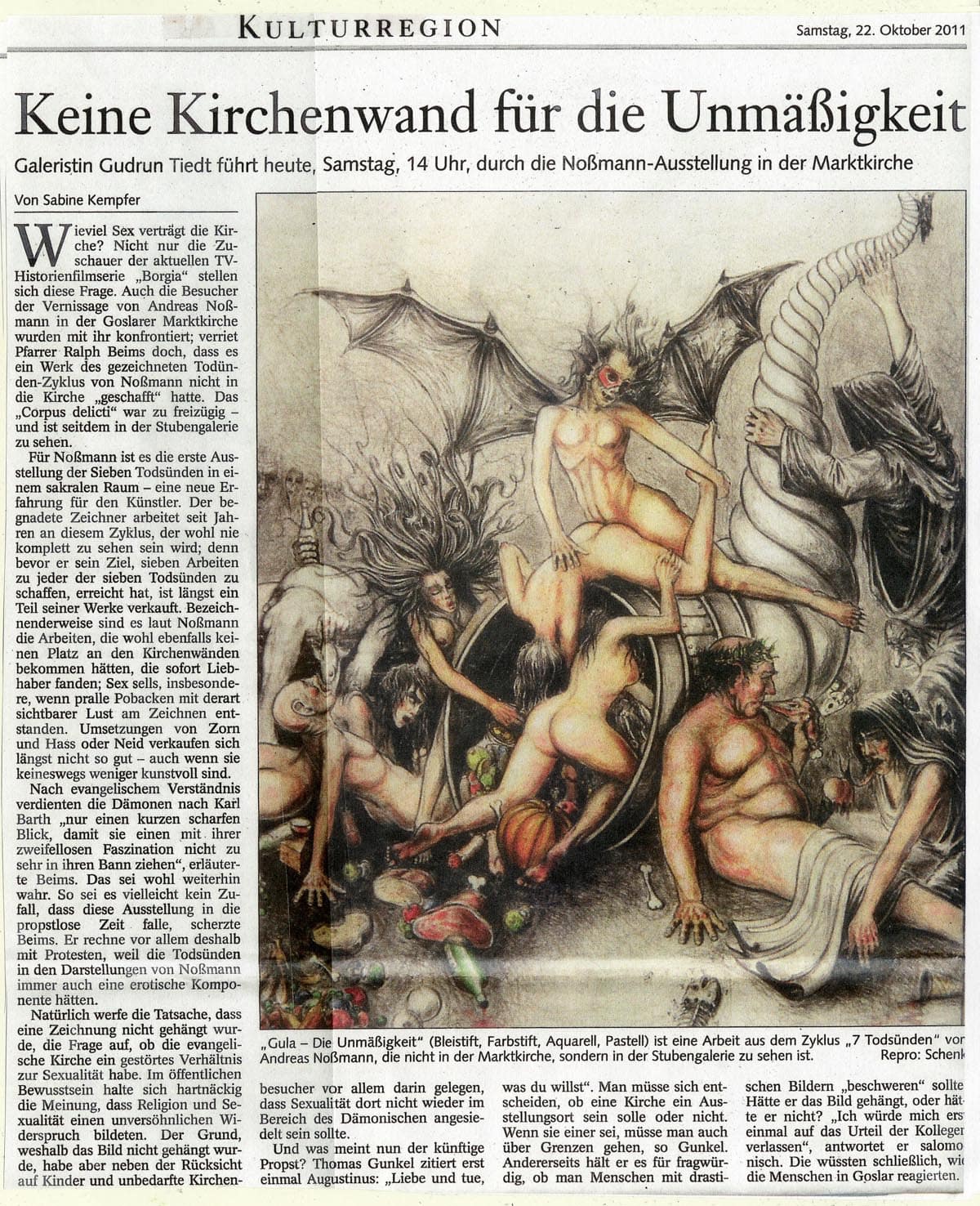 Wieviel Sex verträgt die Kirche? Nicht nur die Zuschauer der aktuellen TV-Historienfilmserie „Borgia“ stellen sich diese Frage. Auch die Besucher der Vernissage von Andreas Noßmann in der Goslarer Marktkirche wurden mit ihr konfrontiert; verriet Pfarrer Ralph Beims doch, dass es ein Werk des gezeichneten Todsünden-Zyklus von Noßmann nicht in die Kirche „geschafft“ hatte. Das „Copus delicti“ war zu freizügig – und ist seitdem in der Stubengalerie zu sehen.