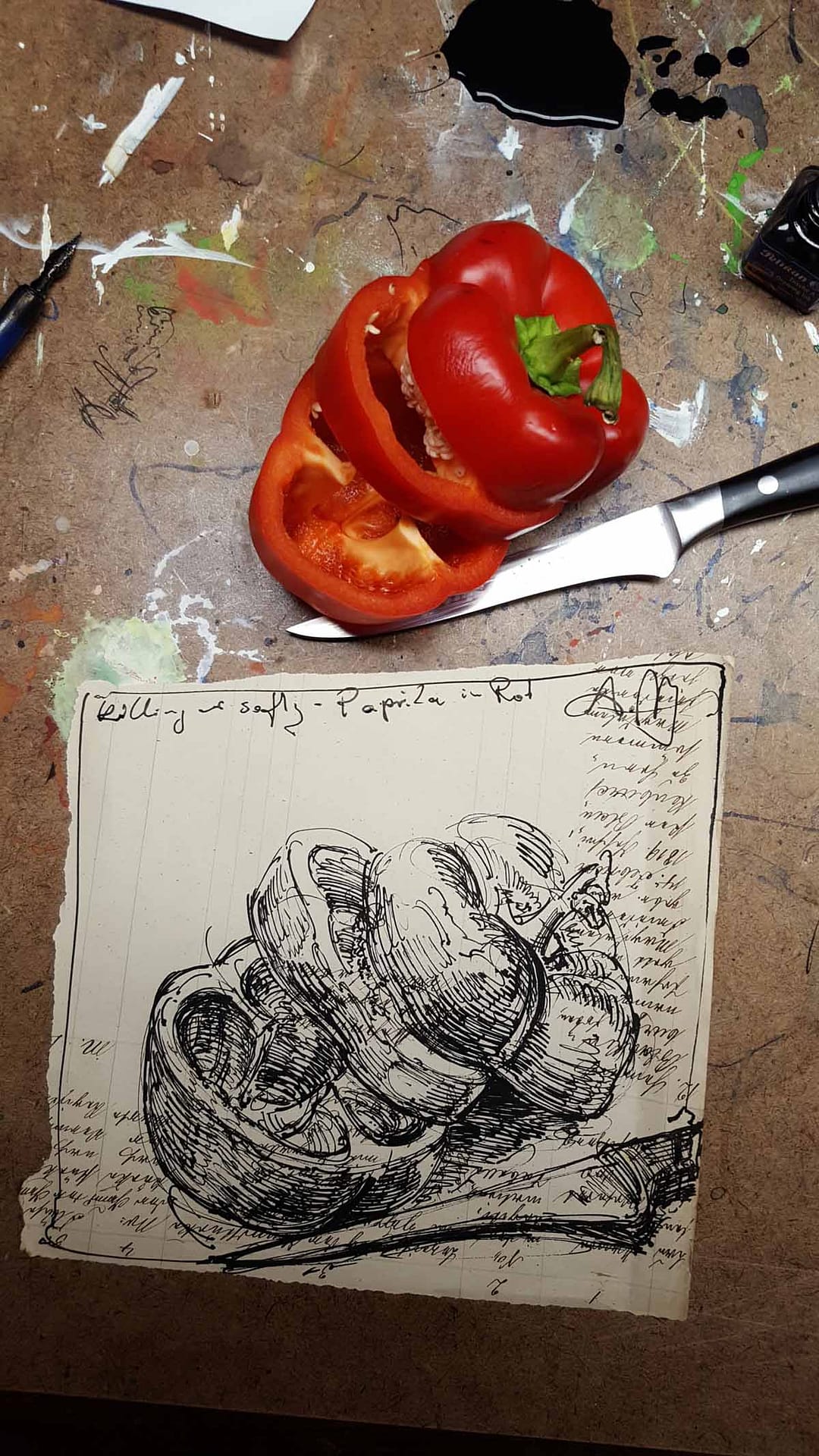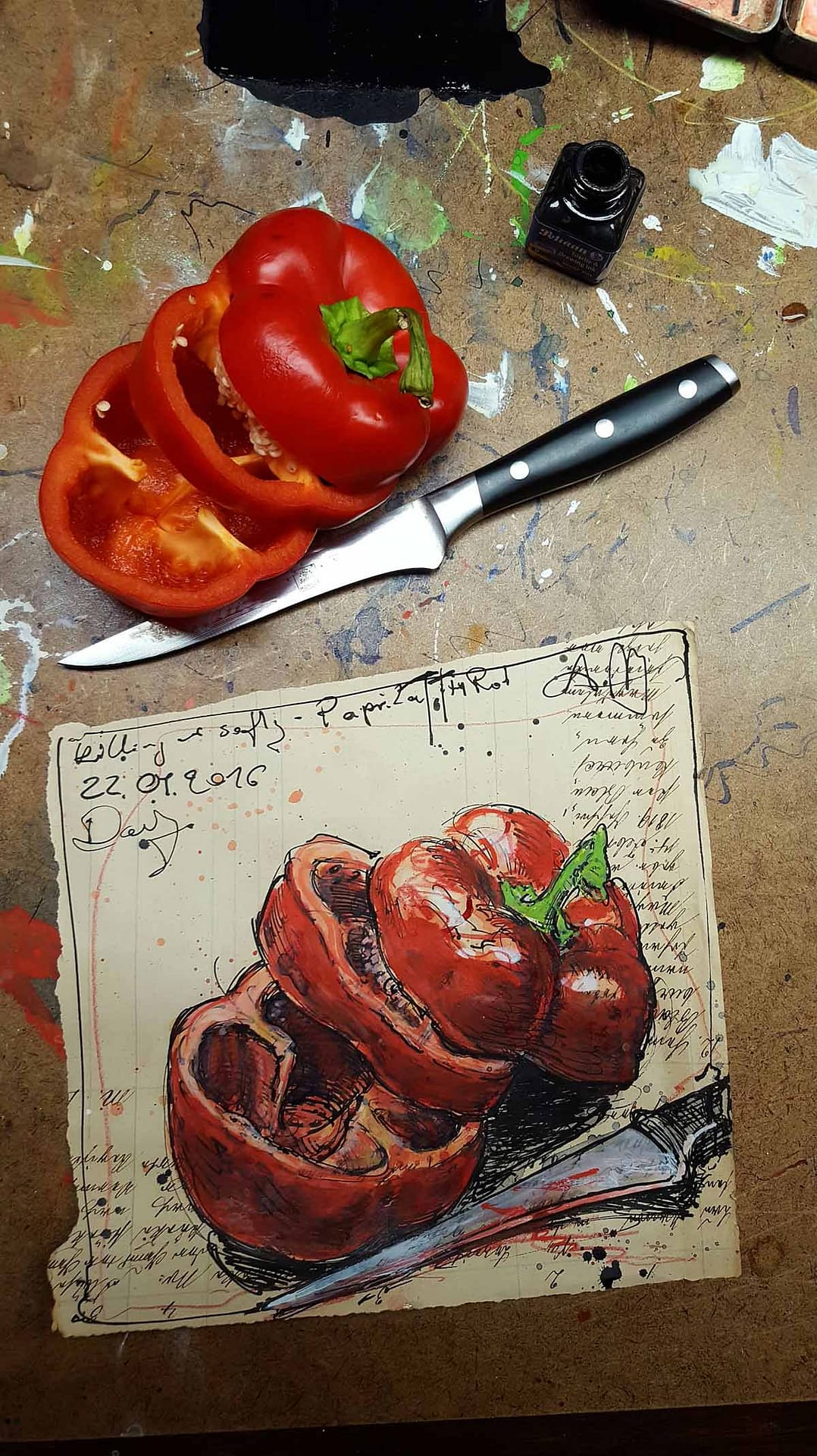 Killing me softly, Paprika tot, in rotArbeiten - Step by Step30. September 201610. Oktober 20168,07 x 8,07 inch, water color, pen and ink, colored pencil 20,5 x 20,5 cm Federzeichnung, Aquarell, Farbstift Views: 0Vorheriger BeitragHamburger HauptbahnhofNächster BeitragBeim Häuten einer Zwiebel