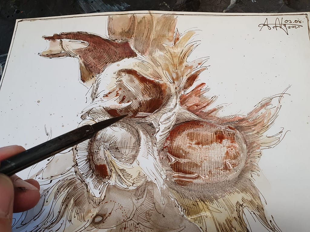Federzeichnung, Farbstift, Aquarell