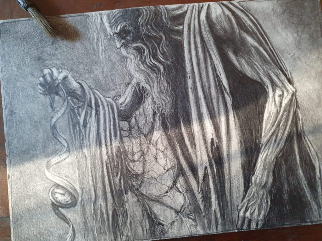 Der Titan Kronos, der seinen eigenen Vater vom Thron stieß, wurde nun, nach Jahrhunderte andauernden Kriegen, der Titanomachie und Gigantomachie, wiederum von seinem eigenen Sohn Zeus und dessen Geschwister entmachtet. Zeus verbannte seinen Vater an den tiefsten Punkt der Welt, dem Tartaros und verfluchte ihn damit, die Unendlichkeit zu vermessen. Hier nun eine zweite, kleine Zeichnung zum Thema. Die erste Arbeit hierzu, aus dem letzten Jahr, finden Sie hier …