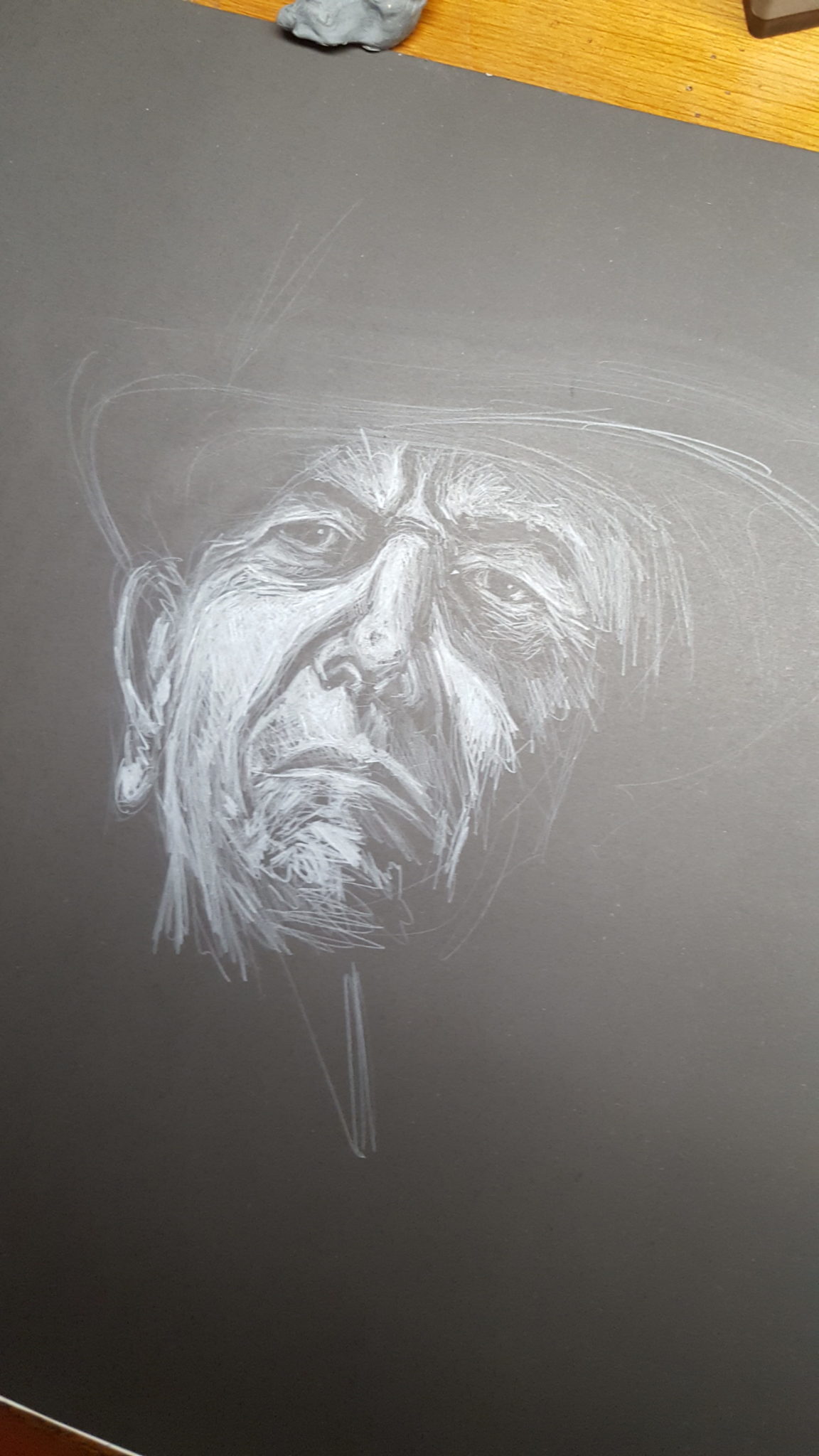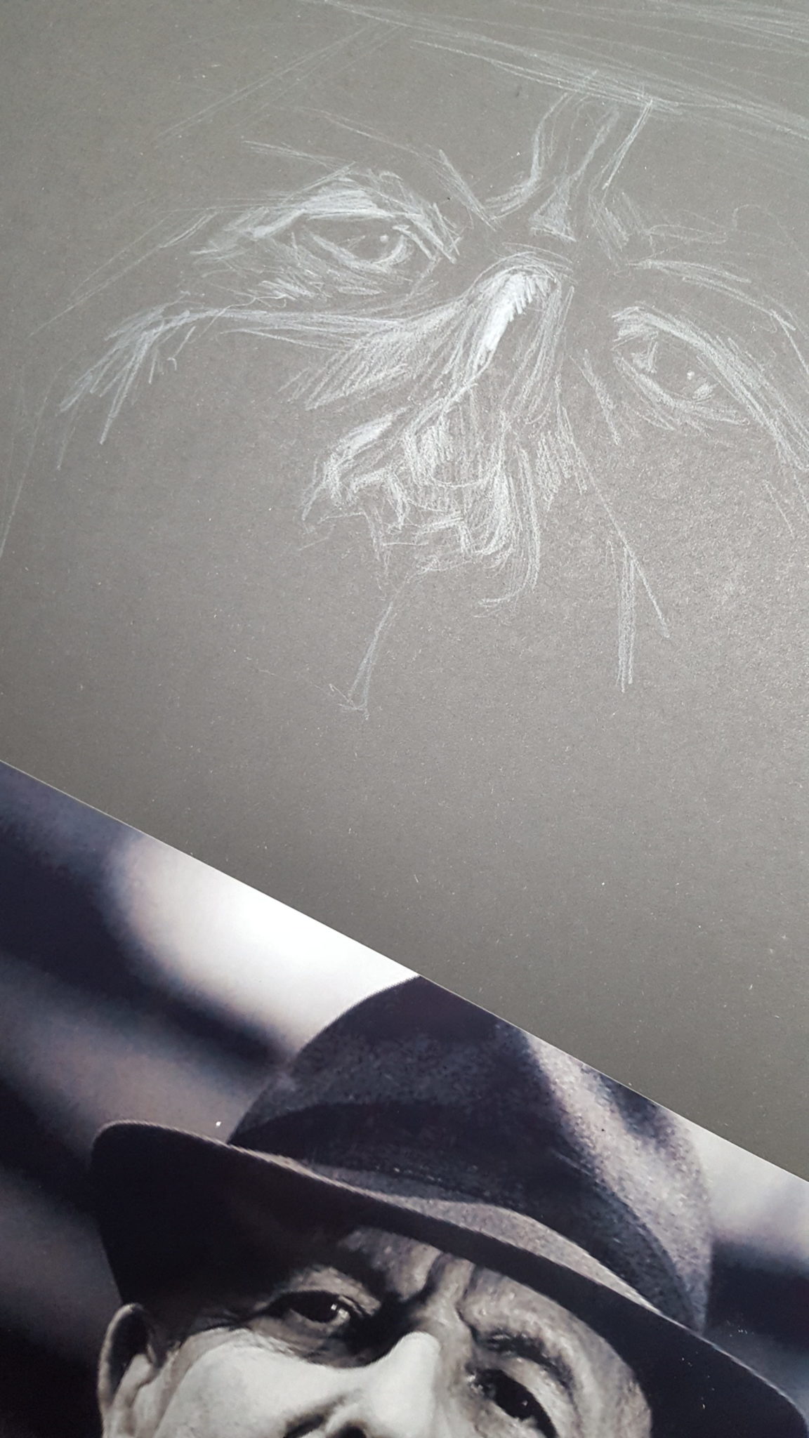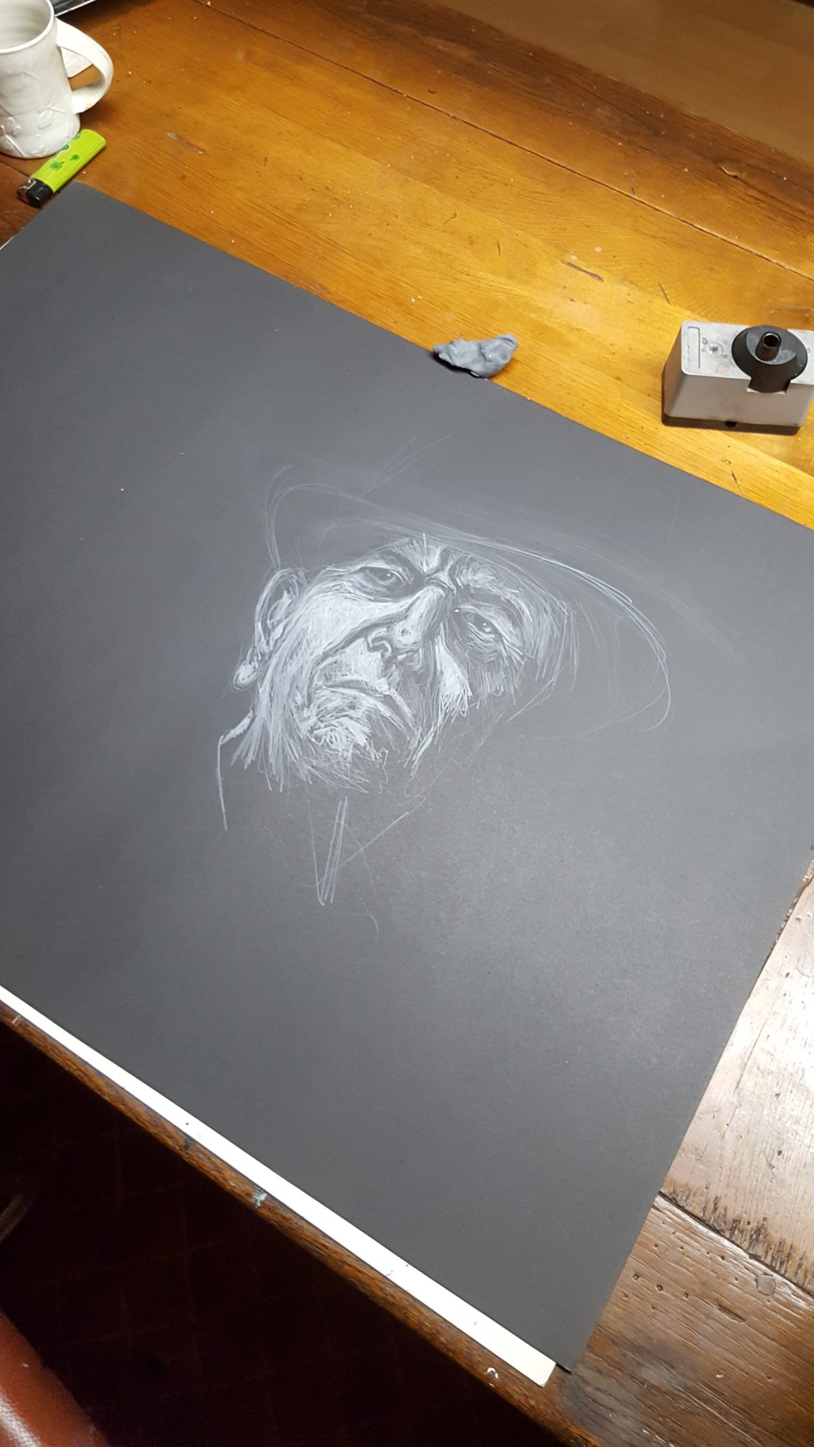 weißer Stift, Farbstift, weiße und schwarze Tusche auf schwarzer Pappe