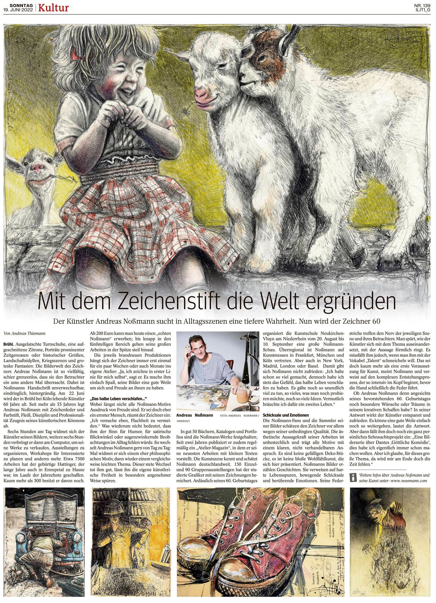 Ausgelatschte Turnschuhe, eine aufgeschnittene Zitrone, Porträts prominenter Zeitgenossen oder historischer Größen, Landschaftsidyllen, Kriegsszenen und groteske Fantasien: Die Bilderwelt des Zeichners Andreas Noßmann ist so vielfältig, schier grenzenlos, dass sie den Betrachter ein ums andere Mal überrascht. Dabei ist Noßmanns Handschrift unverwechselbar, eindringlich, hintergründig. Am 22. Juni wird der in Brühl bei Köln lebende Künstler 60 Jahre alt. Seit mehr als 35 Jahren legt Andreas Noßmann mit Zeichenfeder und Farbstift, Fleiß, Disziplin und Professionalität Zeugnis seinen künstlerischen Könnens ab.