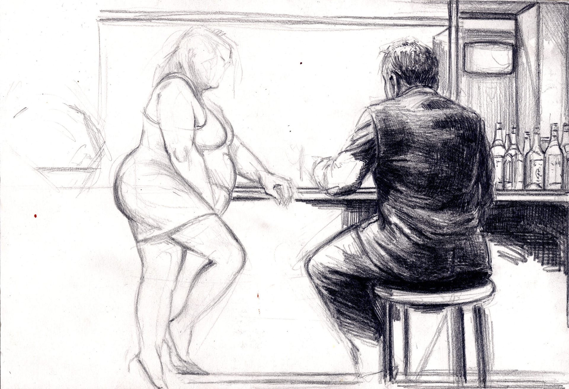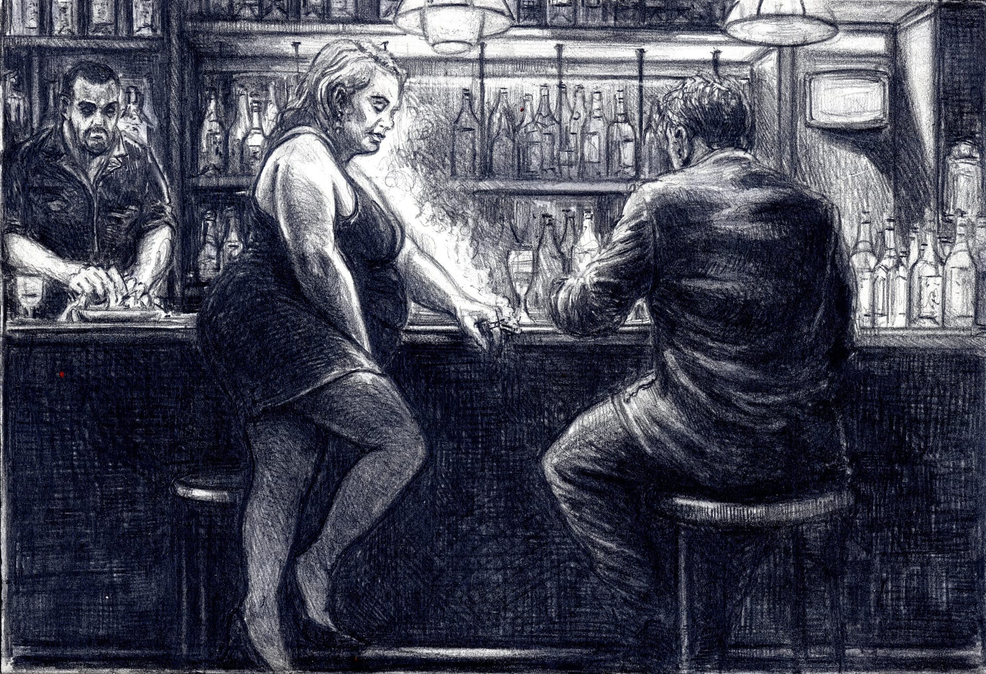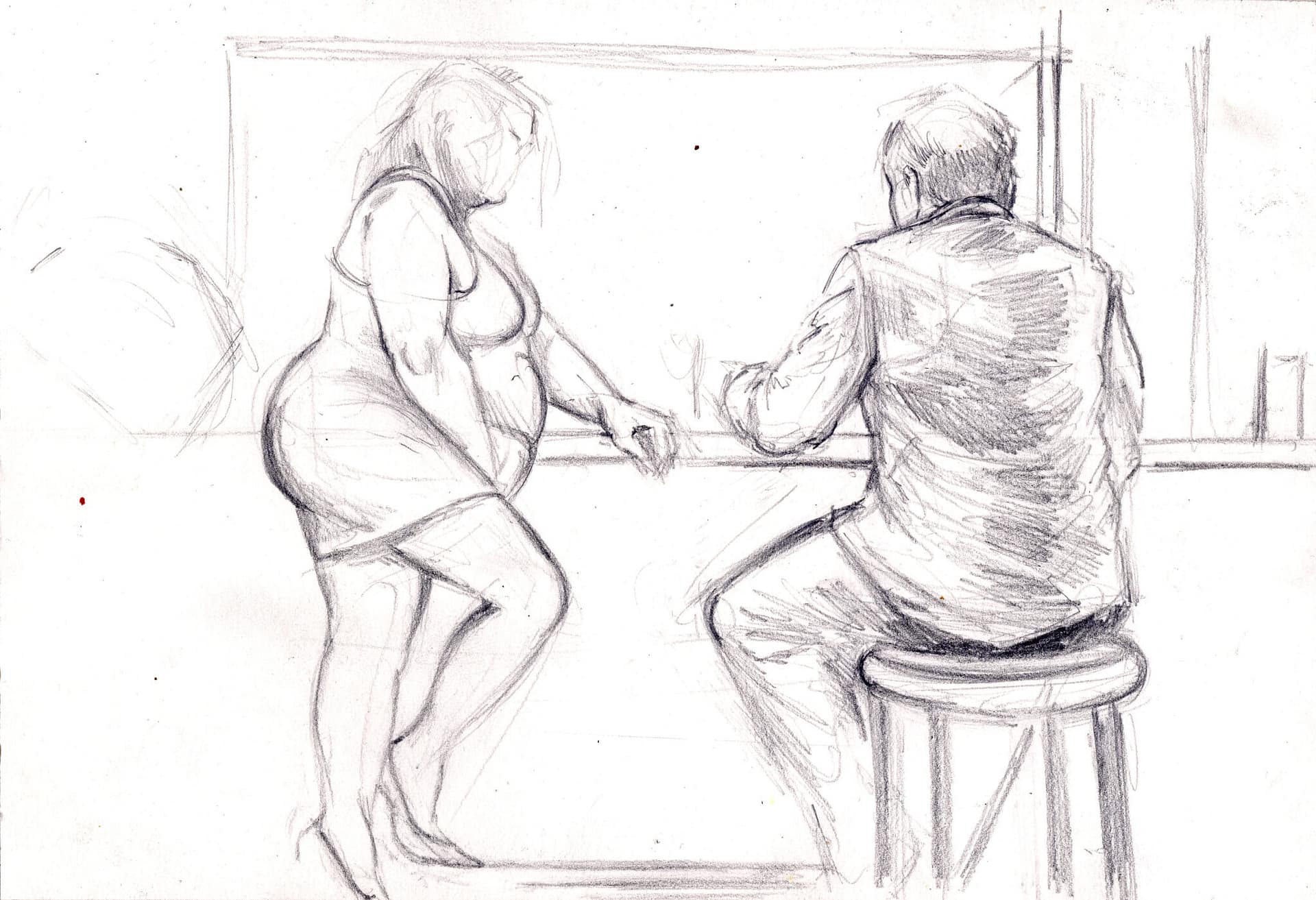 Die zweite kleine „Kneipen“ oder „Nachtclub“ Szenerie dessen verlassen, nächtliche Stimmung der Nachteulen mit viel Aufwand betrieben wurde. Auch hier ist das reine Schwarzweiß des Bleistiftes die wichtige Grundlage für bedachtes Kolorieren mit Aquarell und Farbstiften.