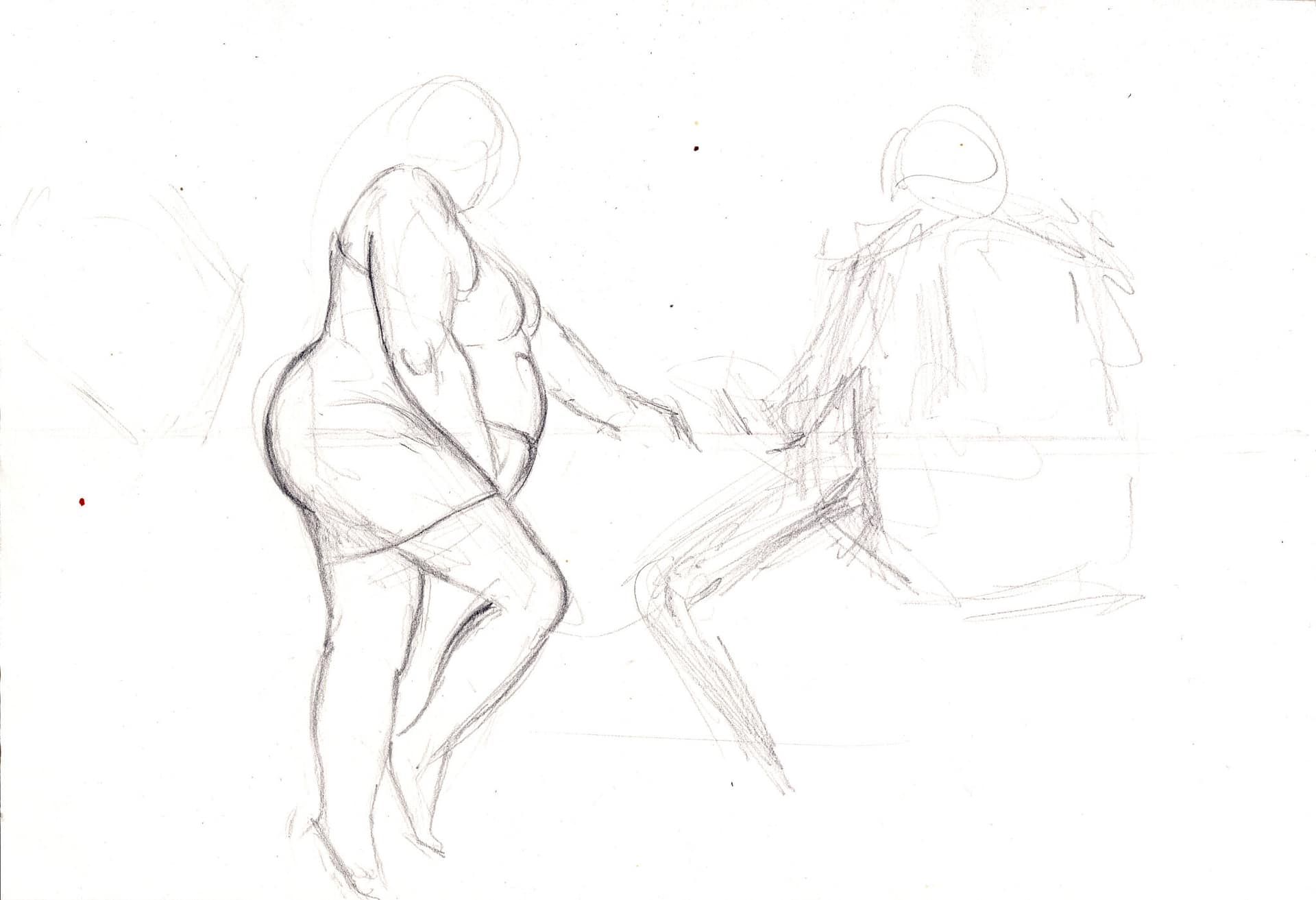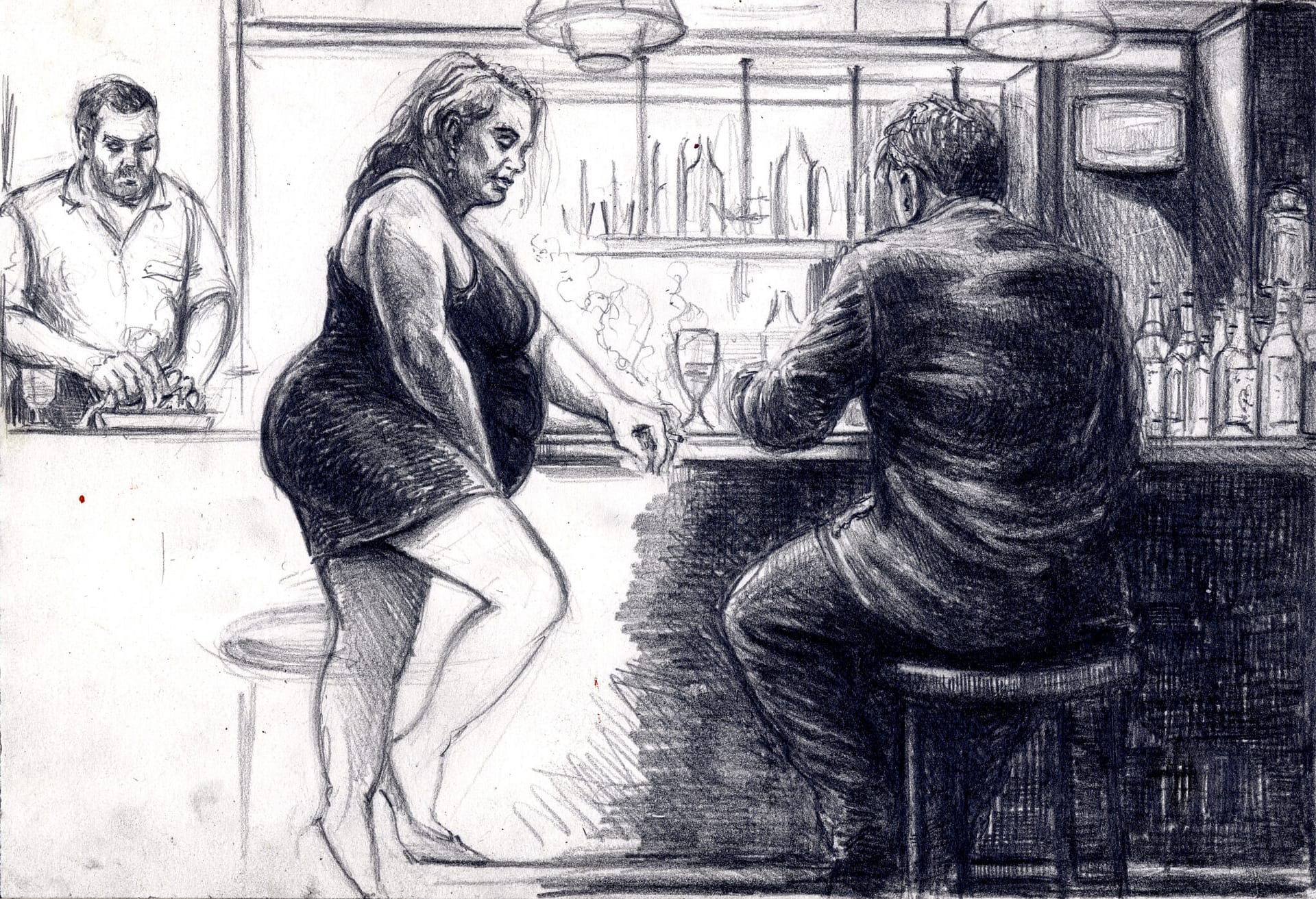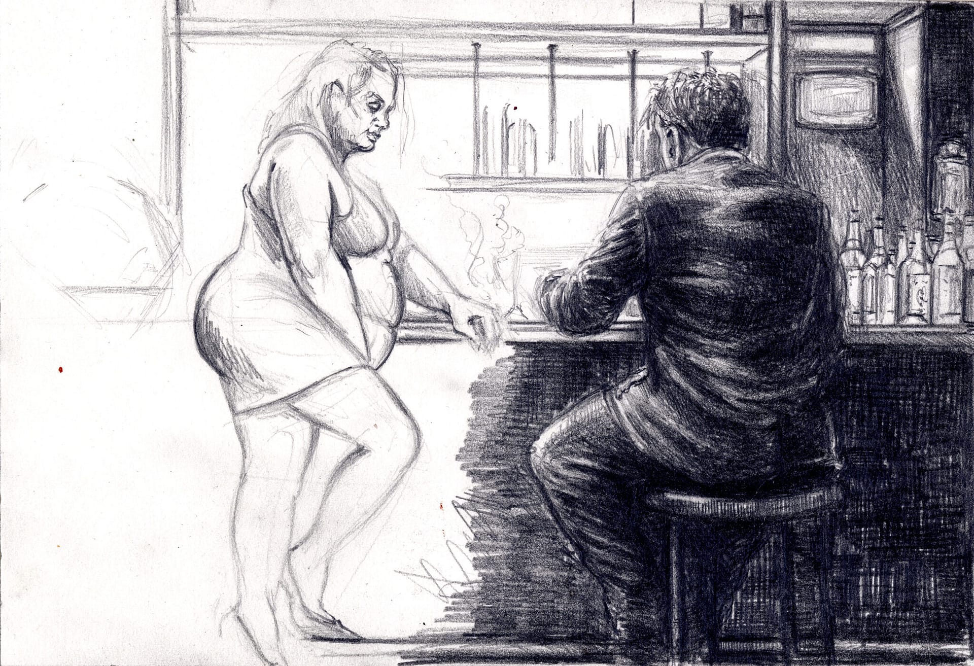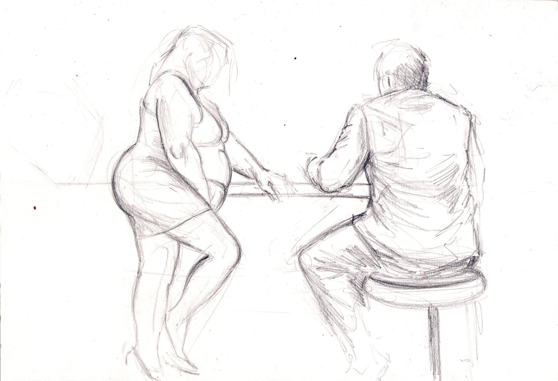 Die zweite kleine „Kneipen“ oder „Nachtclub“ Szenerie dessen verlassen, nächtliche Stimmung der Nachteulen mit viel Aufwand betrieben wurde. Auch hier ist das reine Schwarzweiß des Bleistiftes die wichtige Grundlage für bedachtes Kolorieren mit Aquarell und Farbstiften.