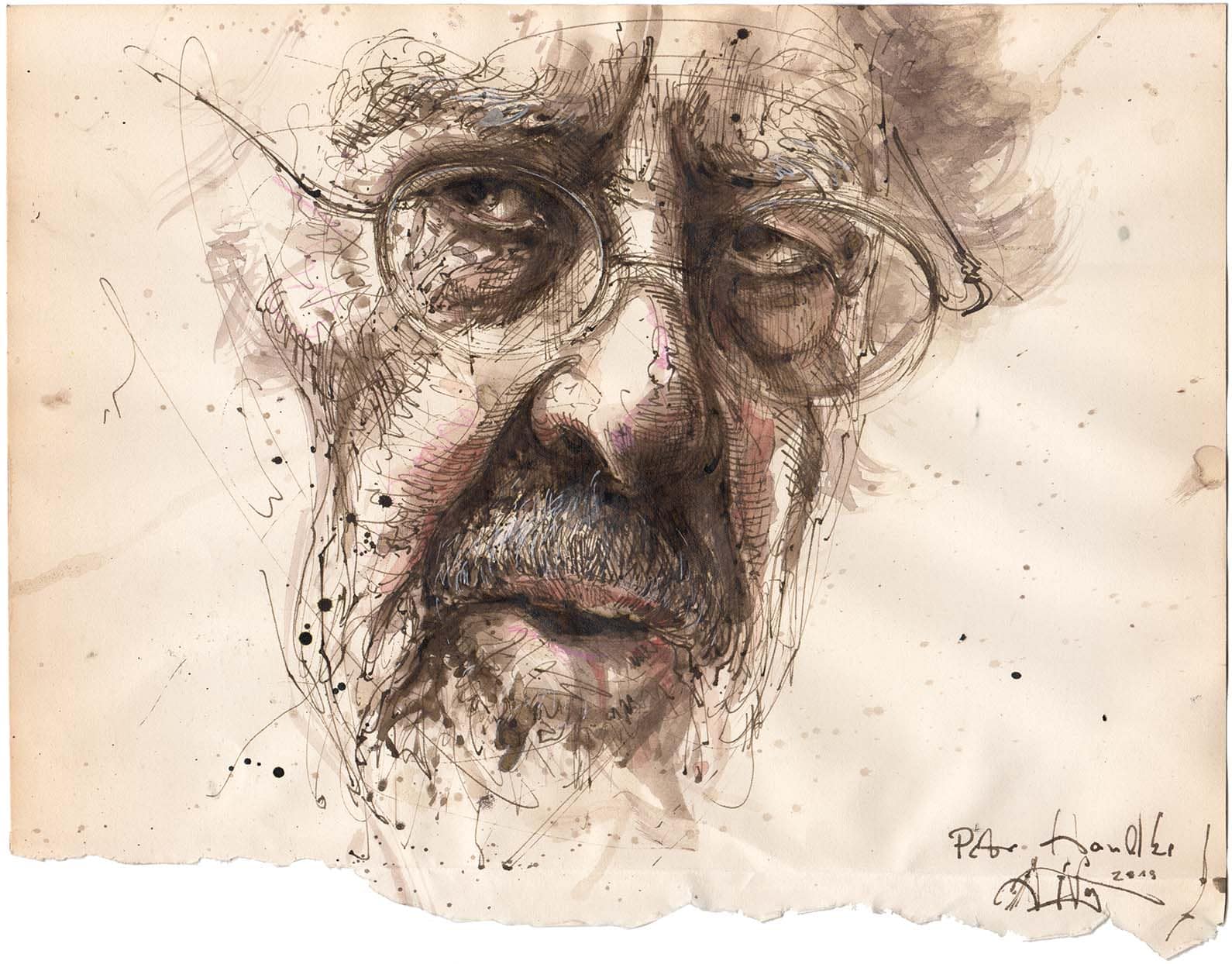 Auf Wunsch des Deutschen Aphorismus-Archiv Hattingen e.V., welcher zusammen mit dem Kunstverein Hattingen am 03.11.2019 (17 Uhr, Altes Rathaus Hattingen) die Ausstellung Portrait & Aphorismus eröffnen wird, entstand dieses Portrait des erst kürzlich mit dem Literaturnobelpreis ausgezeichneten österreichischen Schriftstellers, der nach Meinung der Aphoristiker, selbst auch ein Meister dieses Fachs ist.