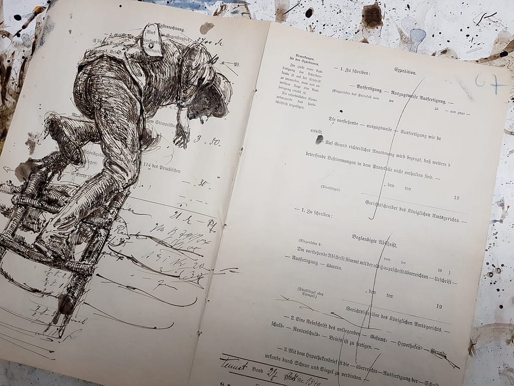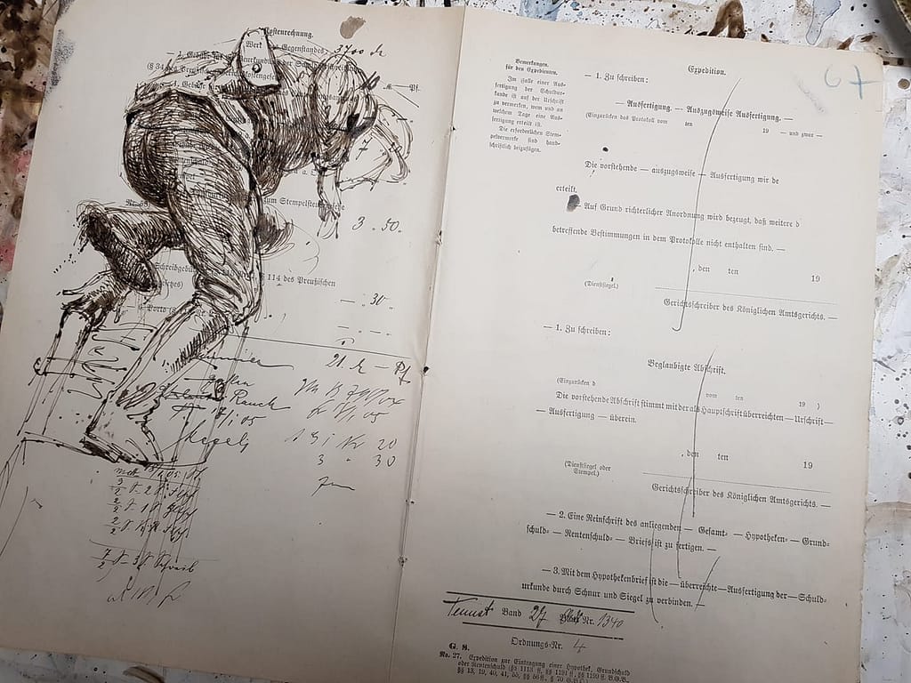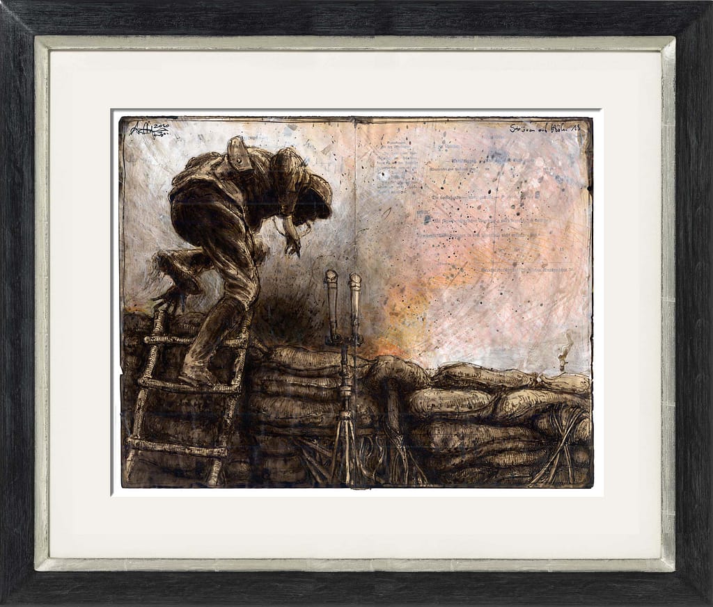 Das zweite Blatt zu Im Westen nichts Neues zeigt einen französischen Offizier der einen dieser verhängnisvollen Angriffe einleitet. Es war der übliche militärische Ablauf, dass er, als Anführer und moralisches Vorbild, als erster über eine Holzleiter aus dem Graben kletterte um seine Einheit, nur mit einer Pistole bewaffnet, gegen die gegnerische Stellung voran zu treiben, stets zum Ansporn seine Trillerpfeife blasend. Die Sinnlosigkeit und das Menschen verachtende des Krieges generell, wurde hier erstmals zur einer Perversion getrieben die zuvor kaum vorstellbar war und bis heute eigentlich nicht wirklich zu begreifen ist.