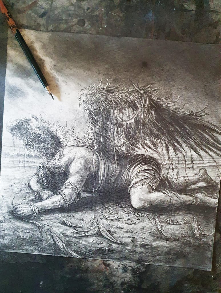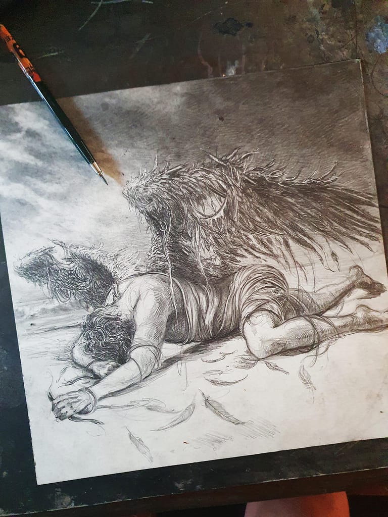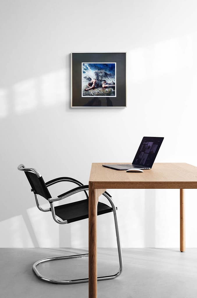 Die Zeichnung zeigt den Moment nach dem Absturz des Ikarus, als er, von den Wellen des Meeres angespült, tot am Boden eines Strandes liegt, umgeben von einigen jener Federn, die sich lösten, als er der Sonne zu nahe kam. Die Darstellung der Tragödie des Ikarus symbolisiert die Gefahren von Übermut und Missachtung von Warnungen. Der Mythos von Ikarus hat viele Interpretationen inspiriert und wird oft als Gleichnis von Überheblichkeit und der Missachtung von Grenzen gesehen.