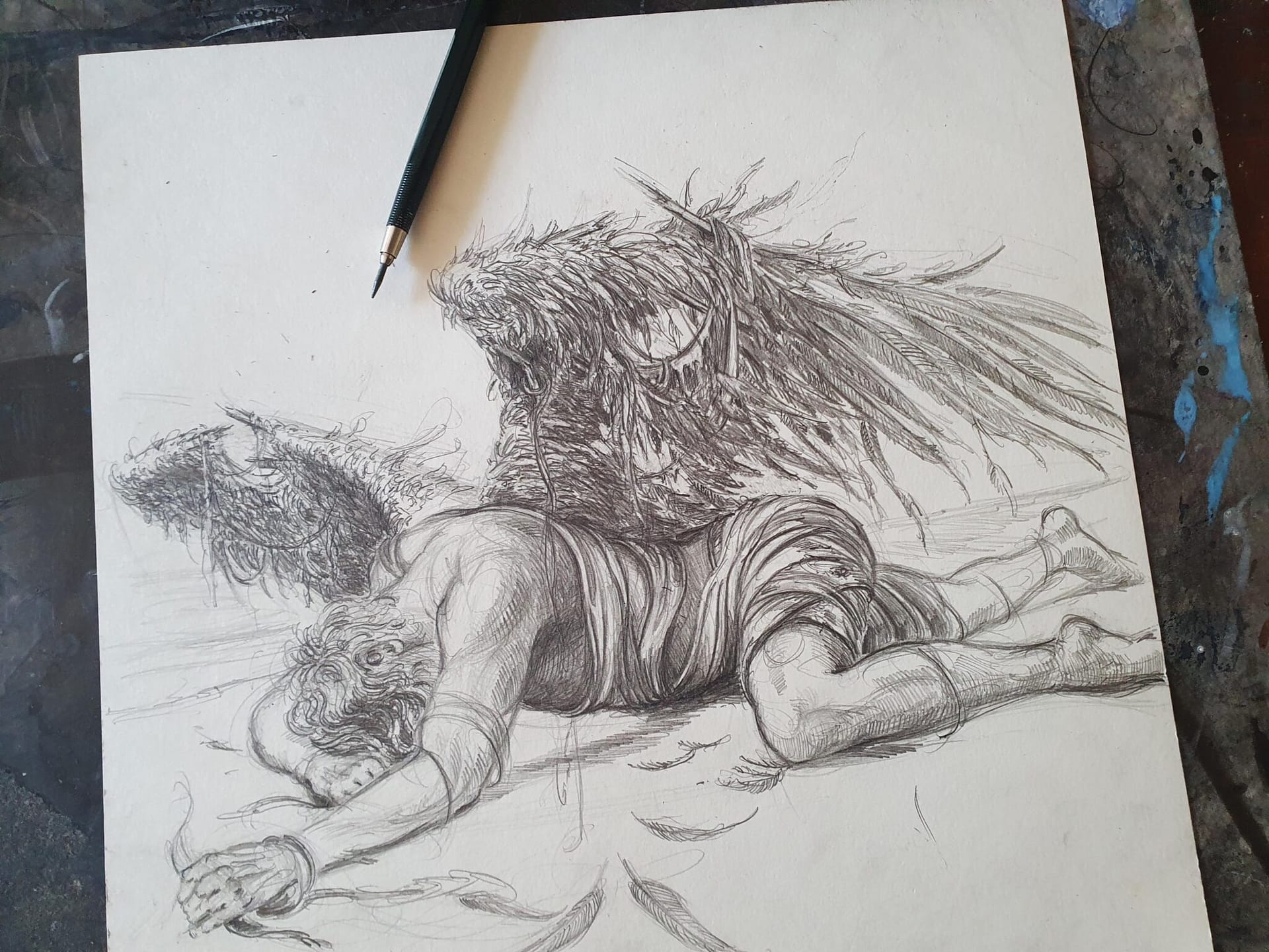 Die Zeichnung zeigt den Moment nach dem Absturz des Ikarus, als er, von den Wellen des Meeres angespült, tot am Boden eines Strandes liegt, umgeben von einigen jener Federn, die sich lösten, als er der Sonne zu nahe kam. Die Darstellung der Tragödie des Ikarus symbolisiert die Gefahren von Übermut und Missachtung von Warnungen. Der Mythos von Ikarus hat viele Interpretationen inspiriert und wird oft als Gleichnis von Überheblichkeit und der Missachtung von Grenzen gesehen.