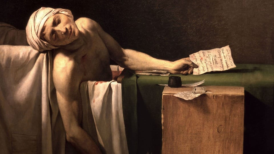 Marat, an einer Hautkrankheit (Seborrhoische Dermatitis) leidend, saß wie immer immer in seiner Badewanne um dessen symptomatischen Juckreize zu lindern, als Charlotte in das Zimmer eintrat. Sie stach sofort zu, mit einer gut 20 cm langen Klinge, in Hals und Brust, kurz über und unter dem Schlüsselbein, wodurch Marat sofort sein Bewusstsein verlor und in nur wenigen Minuten ausblutete. Schon vier Tage nach ihrem Attentat wurde sie guillotiniert und Marat posthum zum wahren Helden der Revolution verklärt, sein Herz einbalsamiert und zum heiligen Relikt der Revolution stilisiert. Aber es sollten noch so viele, so unzählige weitere Köpfe rollen …