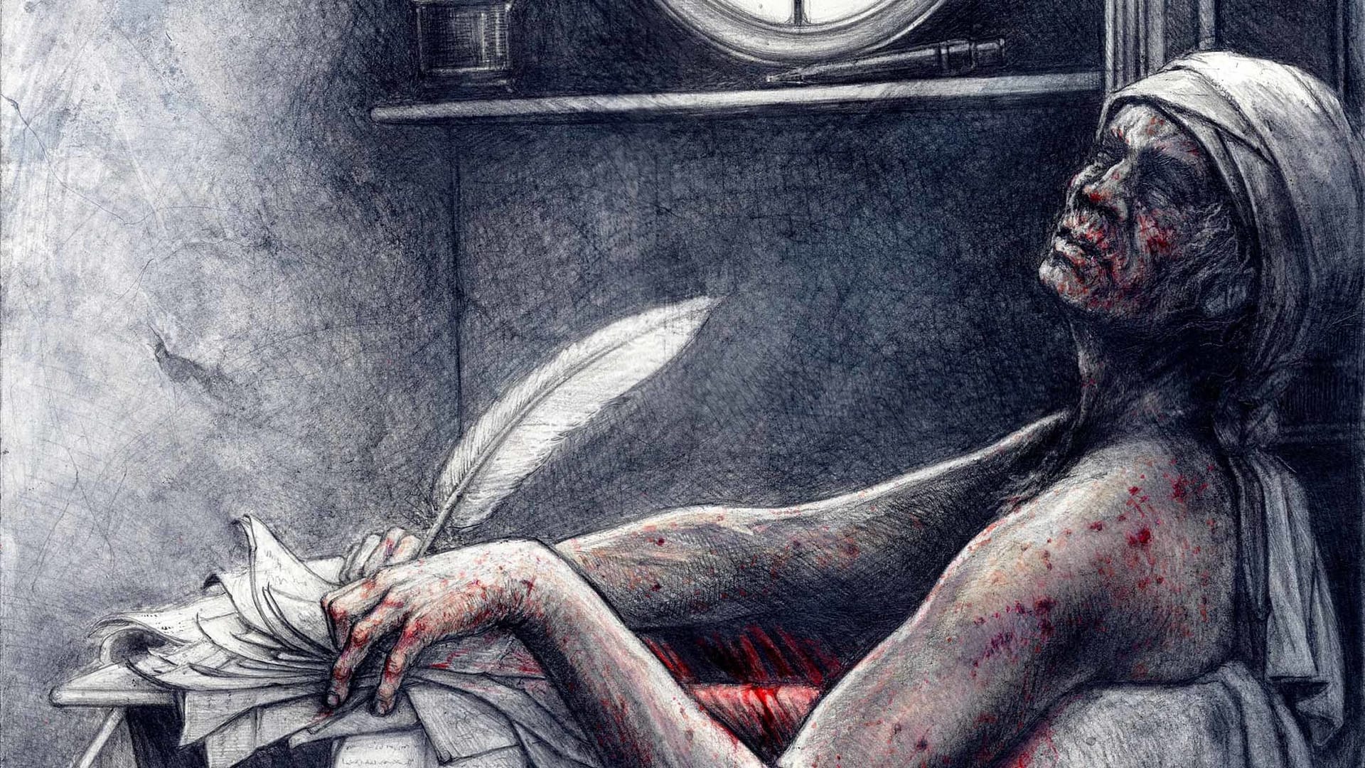 Natürlich entstand diese Zeichnung vor allem in Anerkennung der künstlerischen Leistung Davids, seiner Umsetzung jenes Gemäldes: Tod des Marats. Dieses Werk, welches mich schon ein halbes Leben lang verfolgt, sowie mein Interesse an den Wirren jener Zeit, haben mich nun doch dazu verführt es endlich einmal zu wagen. Ich darf hoffen, dass mein Ansinnen halbwegs gelungen ist.