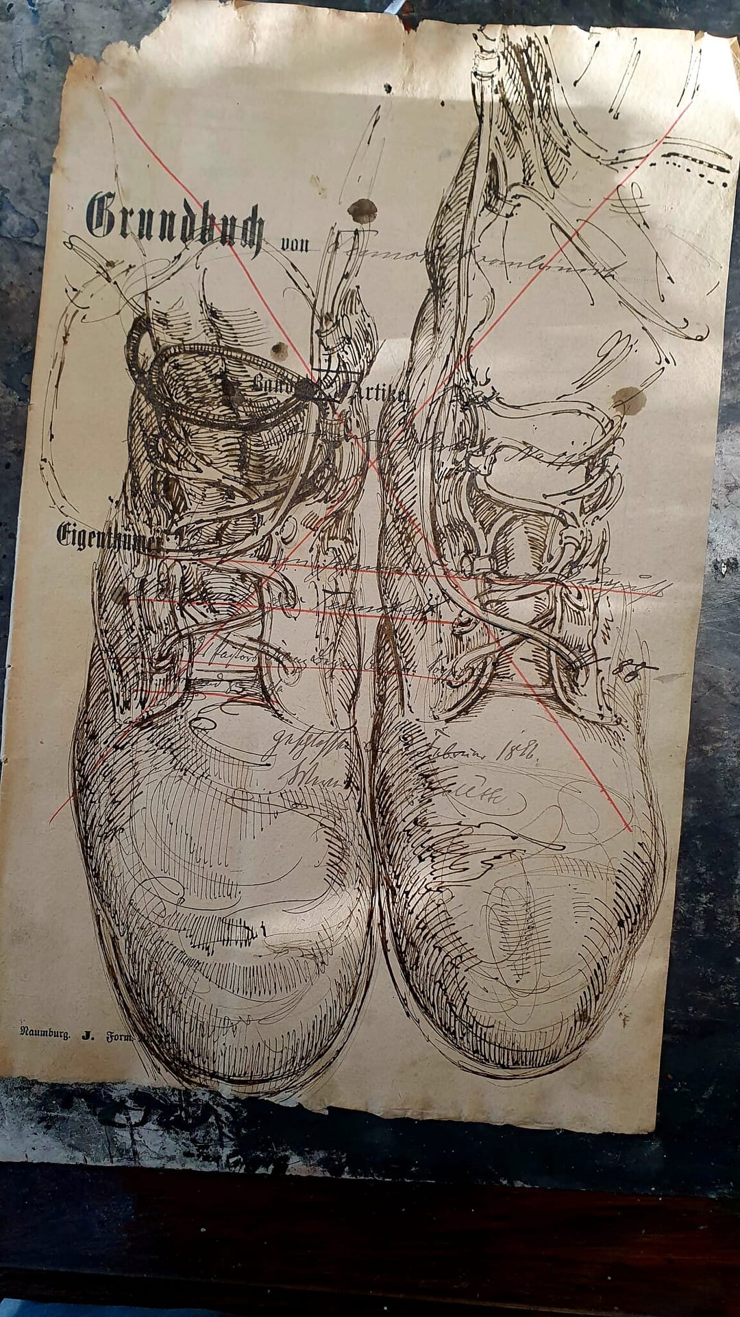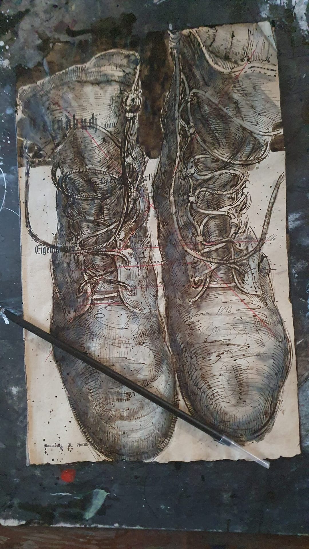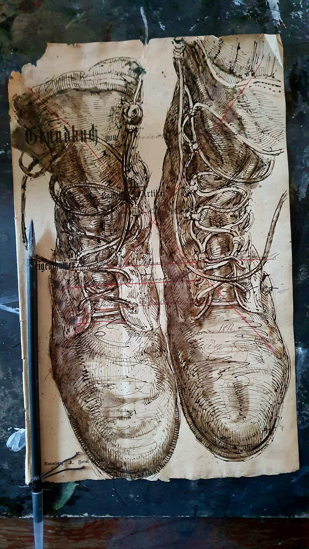 Eine Federzeichnung, mit Aquarell und Farbstiften, eines Paar ausgelatschter Stiefel, auf altem Grundbuchaktenpapier. Wer genau aufpasst, wird die ursprüngliche Datierung von 1896 schnell erkennen.