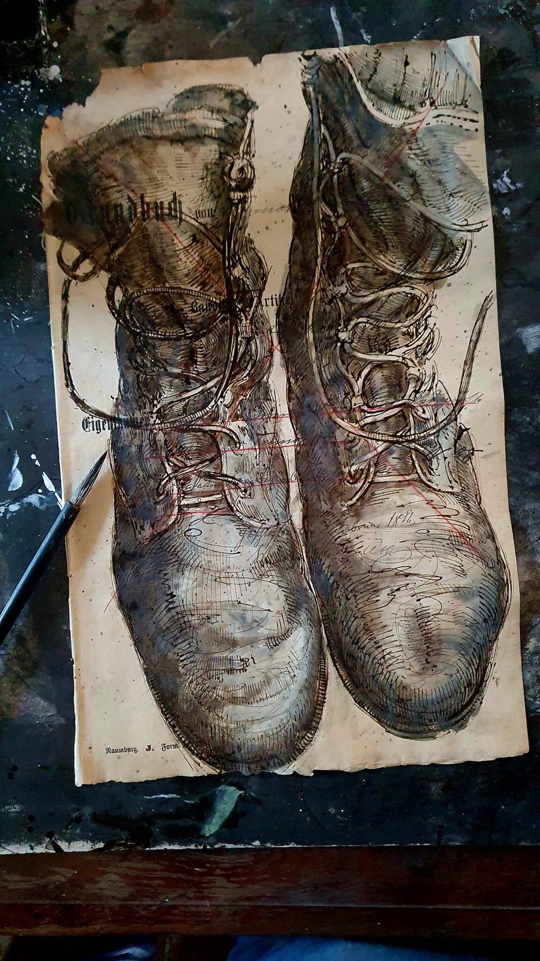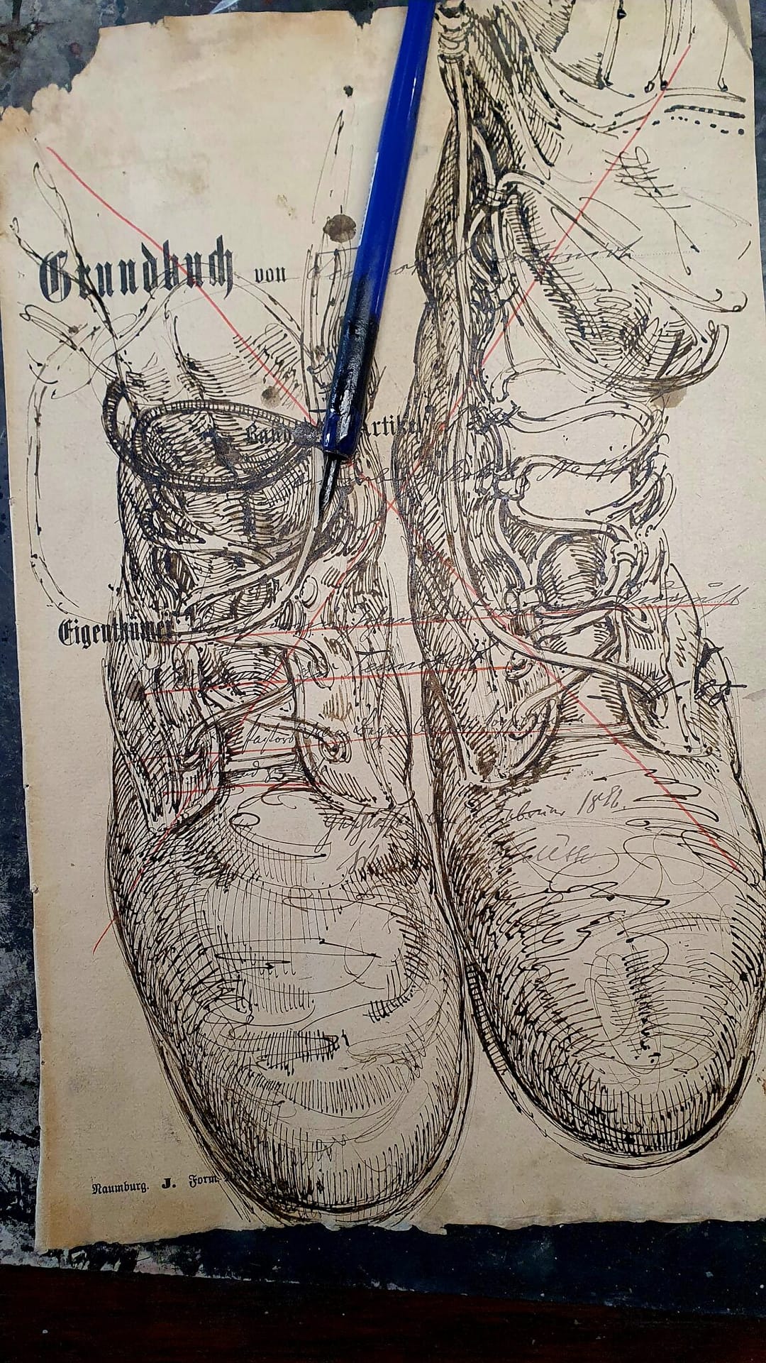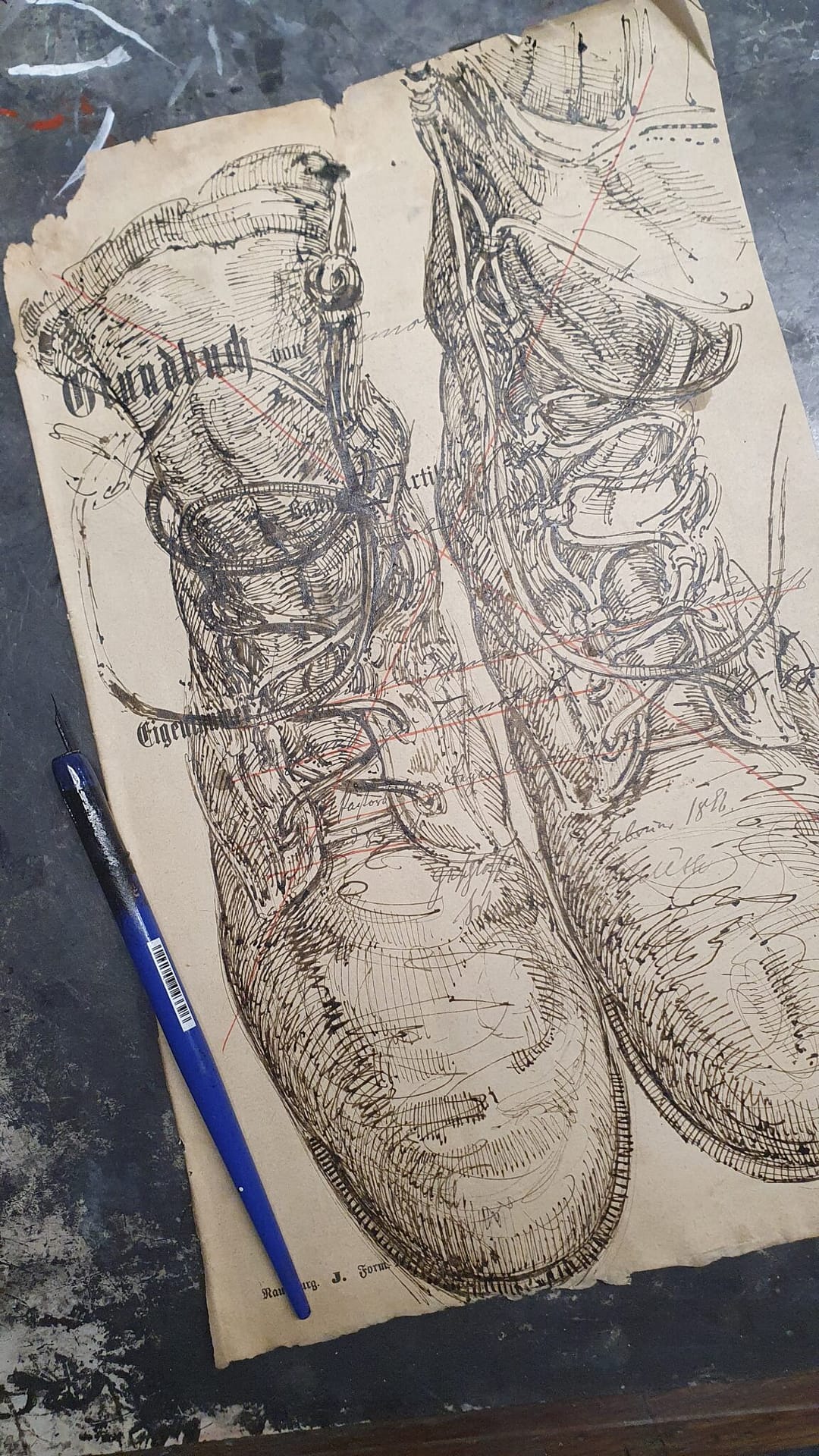 Eine Federzeichnung, mit Aquarell und Farbstiften, eines Paar ausgelatschter Stiefel, auf altem Grundbuchaktenpapier. Wer genau aufpasst, wird die ursprüngliche Datierung von 1896 schnell erkennen.