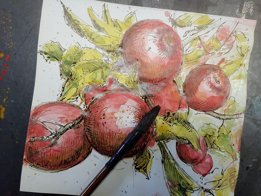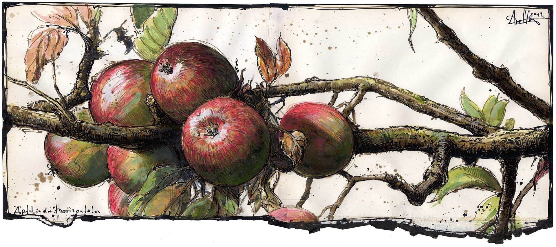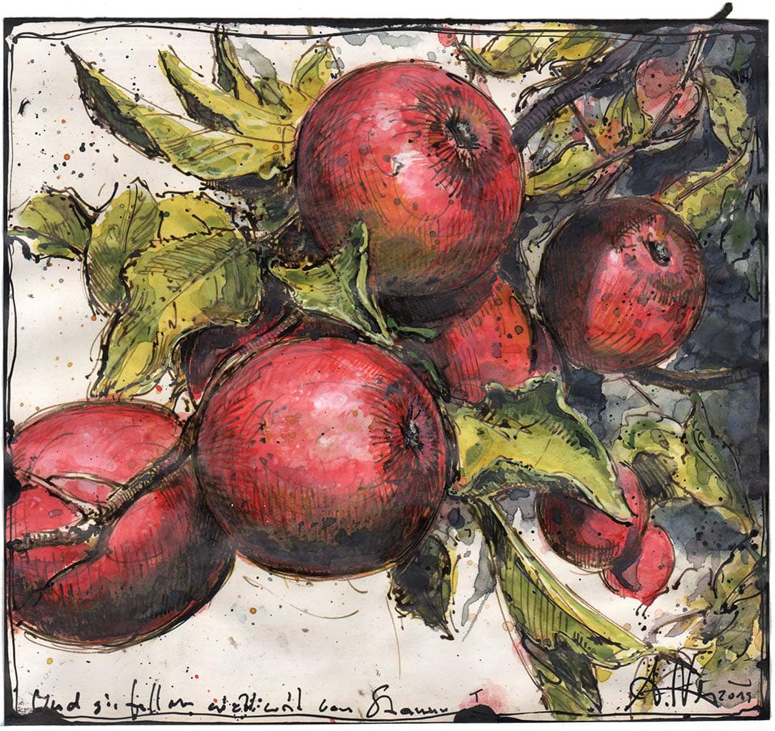 Und weil es so schön war, gleich ein noch zweites Blatt zu diesem leckeren Idyll – und dieses mit dem wirklich einfachen Titel: Äpfel in der Horizontalen …