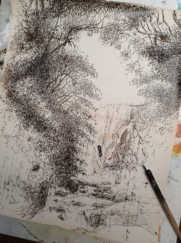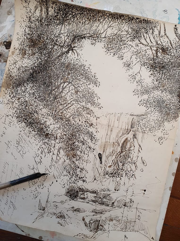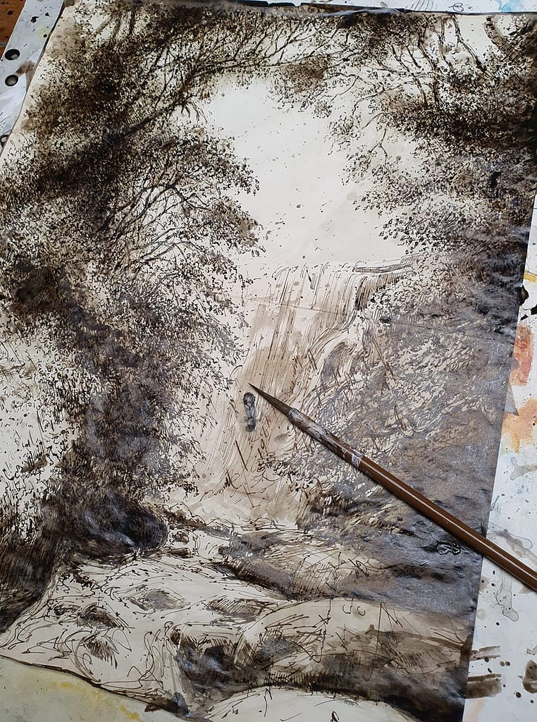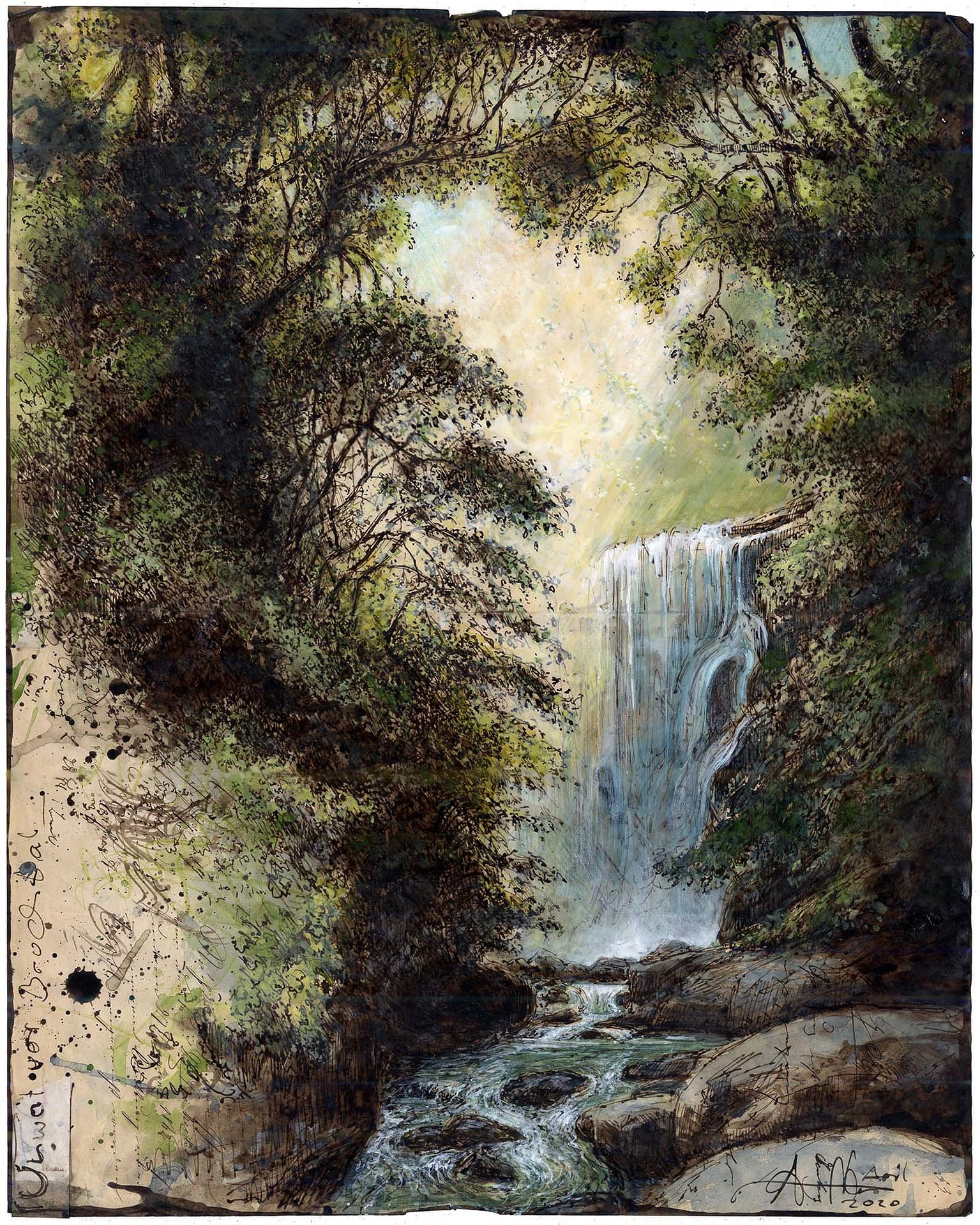 Nach längerer Zeit mal wieder eine etwas größere Landschaftszeichnung, eine Hommage an das sagenumwobene Bruchtal, welches Tolkien Fans sehr wohl vertraut sein dürfte. Am westlichen Rand des Nebengebirges, im Tal des Bruinenflusses gelegen, ist es die Heimat der Elben, Ort des letzten heimeligen Hauses des Herrn Elrond, der Herr der Imladris.