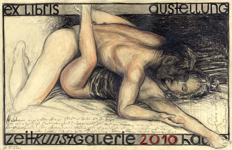 Beides leisten auch jene Exlibris, denen die neue Ausstellung bei Zeitkunst gewidmet ist. Unter dem Motto „Phallusvögel“ zeigen sie die erotische Variante jener Blätter – die natürlich auch als Sammlerstücke sehr begehrt waren und sind. Der neuen Schau zugrunde liegt die Sammlung des Ex-Hallensers Michael Bruglacher, der erotische Exlibris aus mehr als 100 Jahren sein Eigen nennt. Gegenüber gestellt werden sie Arbeiten, die eine Reihe hallescher Künstler aktuell zu dieser thematischen Präsentation beigesteuert haben. Damit flattern neben den meist von Ledas Schwan inspirierten historischen Phallusvögeln, eine Reihe moderner hiesiger Artgenossen durch die Galerie – flankiert durch das eine oder andere weitere erotische Bild des jeweils Beteiligten.