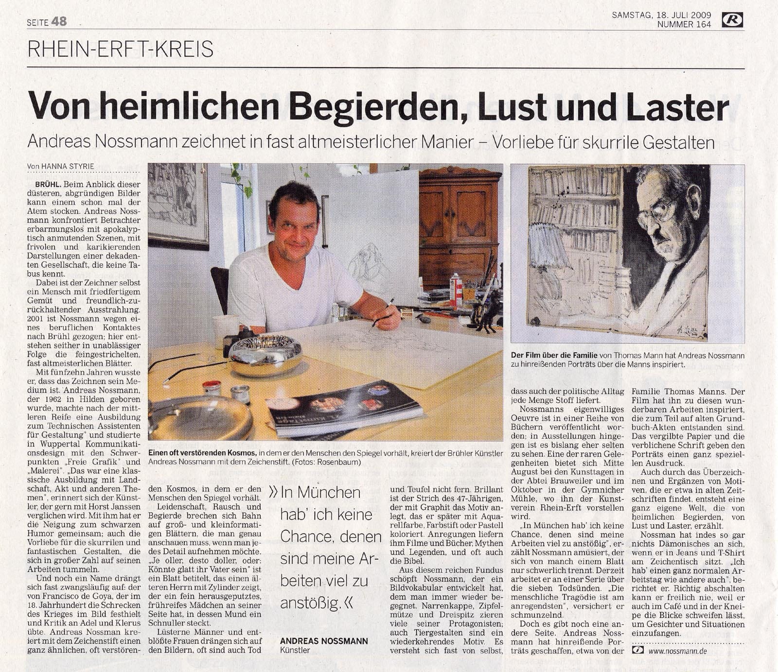 „In München hab ich keine Chance, denen sind meine Arbeiten viel zu anstößig“, erzählt Nossmann amüsiert, der sich von manch einem Blatt nur schwerlich trennt. Derzeit arbeitet er an einer Serie über die sieben Todsünden. „Die menschliche Tragödie ist am anregendsten“, versichert er schmunzelnd.
