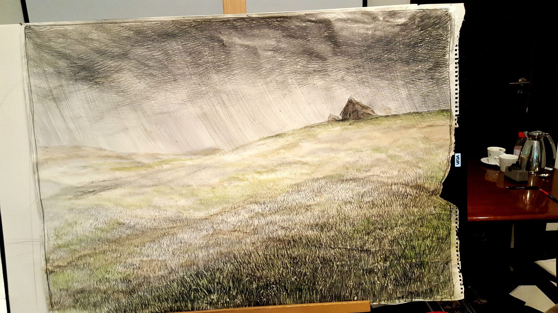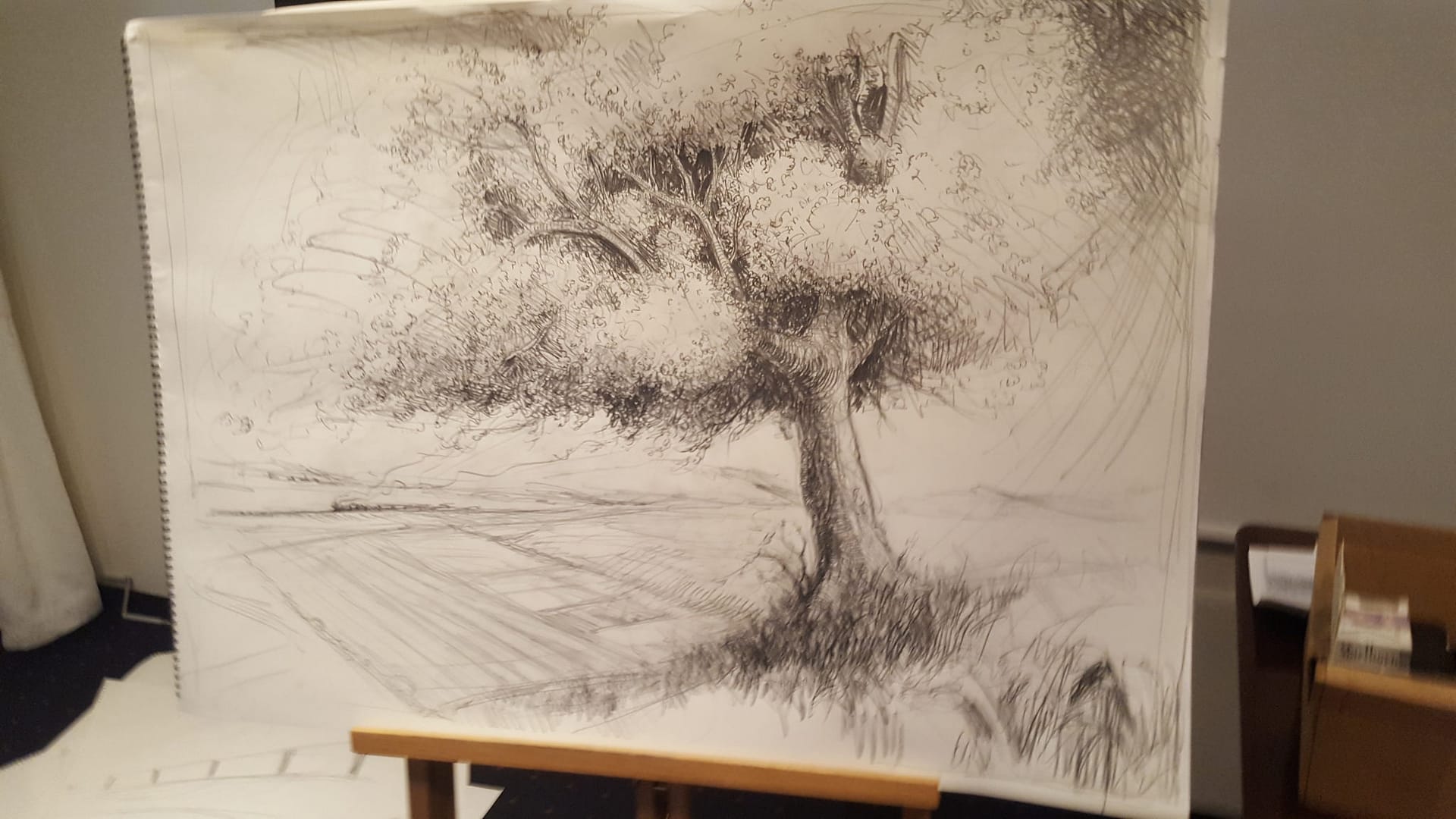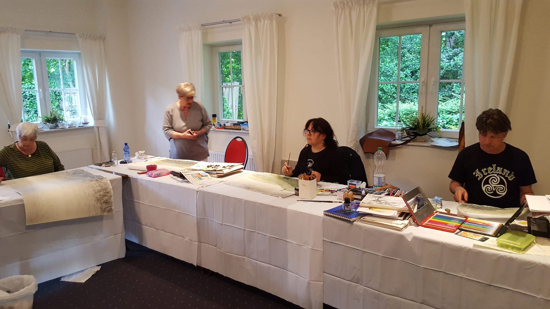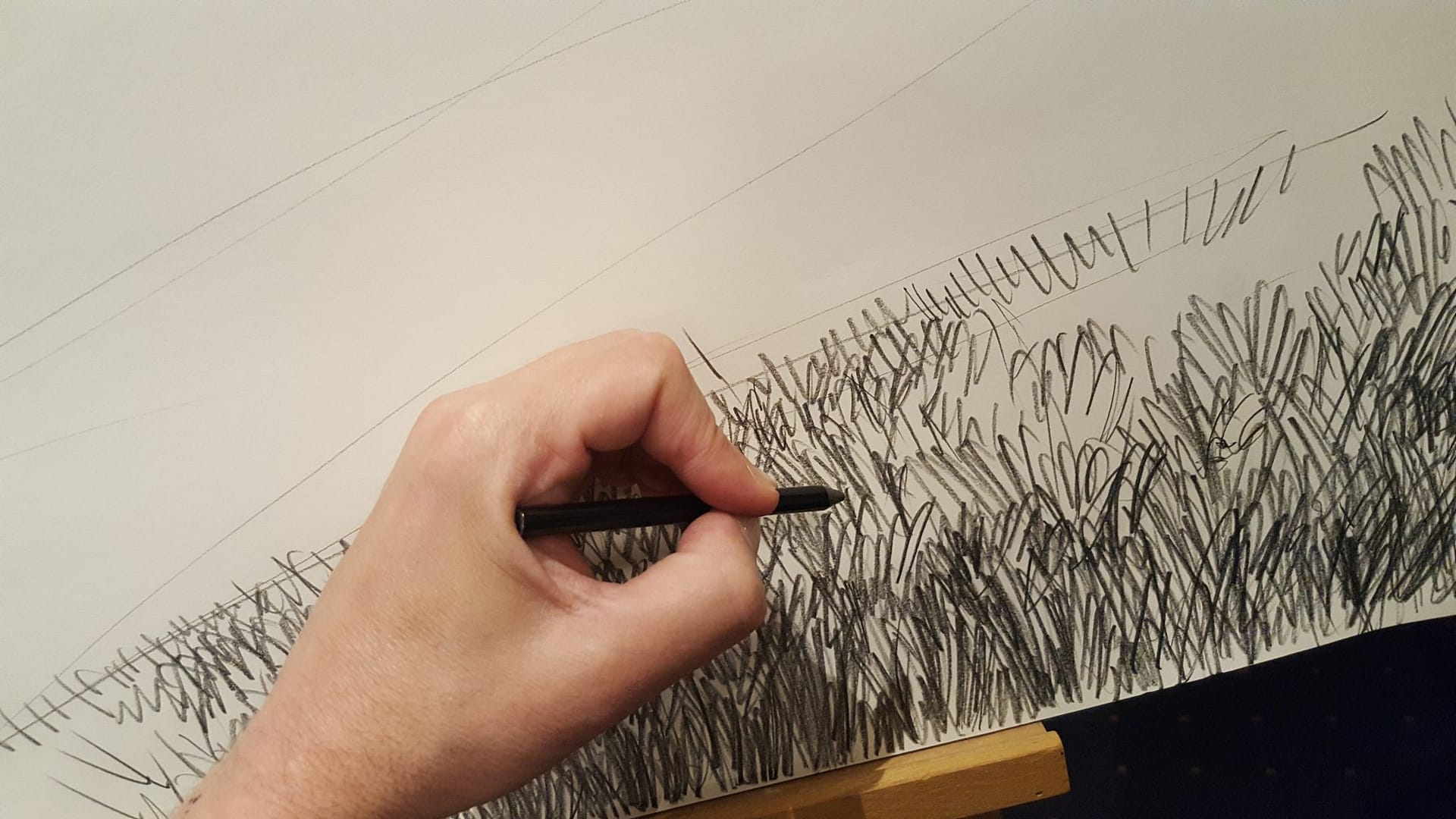 Auch in diesem Jahr war das Wetter leider wieder zeitweise recht unbeständig, was zu längeren Atelieraufenthalten zwang und somit zu zusätzlichen Herausforderungen führte, wie das Schraffieren einer imaginären Graslandschaft, sowie dem erarbeiten des Themas „Man sieht den Wald voller Bäume nicht“.