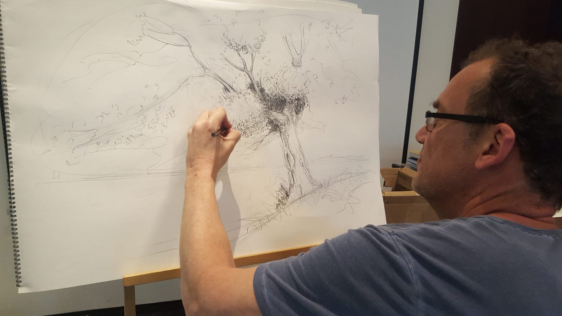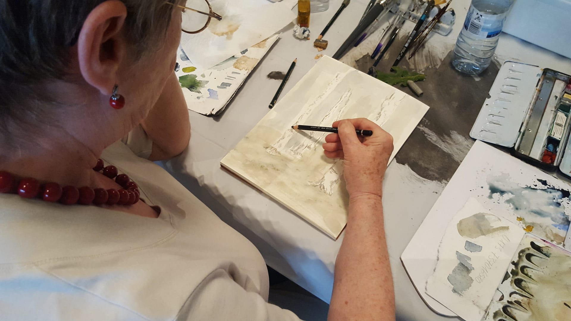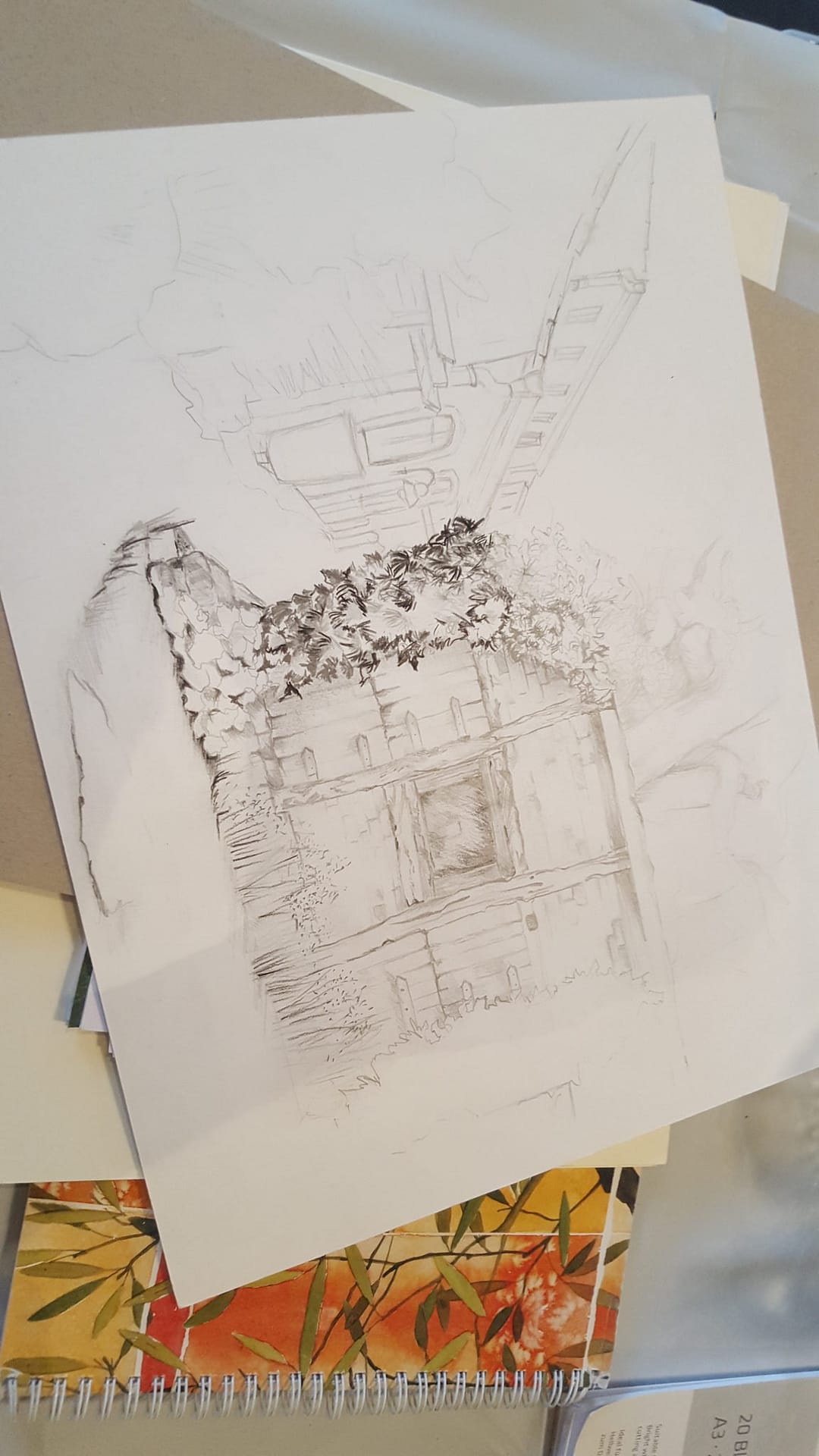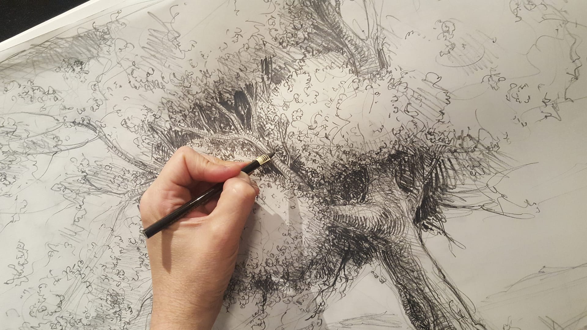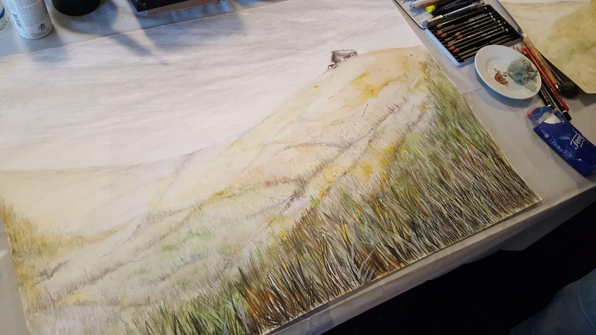 Auch in diesem Jahr war das Wetter leider wieder zeitweise recht unbeständig, was zu längeren Atelieraufenthalten zwang und somit zu zusätzlichen Herausforderungen führte, wie das Schraffieren einer imaginären Graslandschaft, sowie dem erarbeiten des Themas „Man sieht den Wald voller Bäume nicht“.