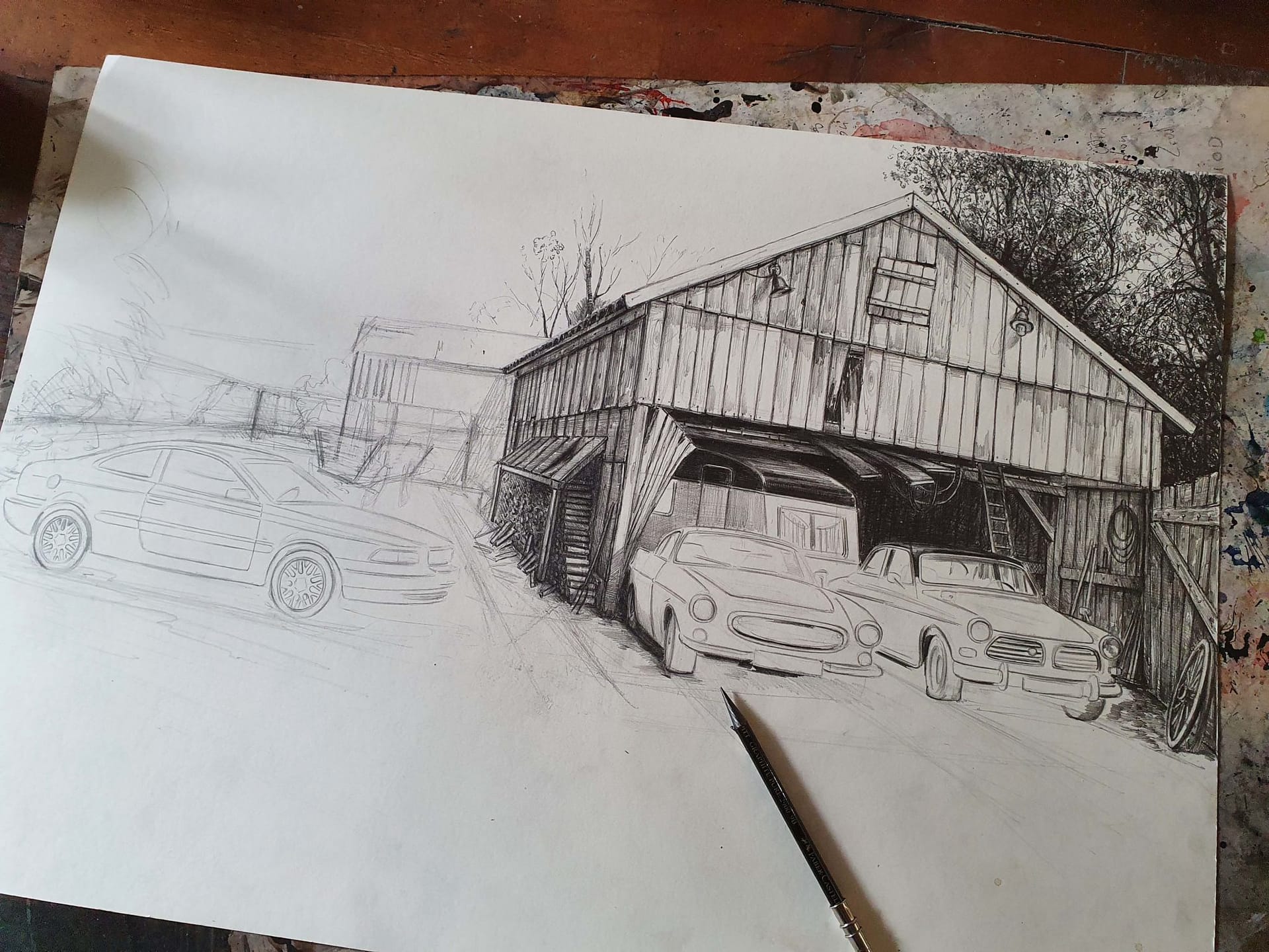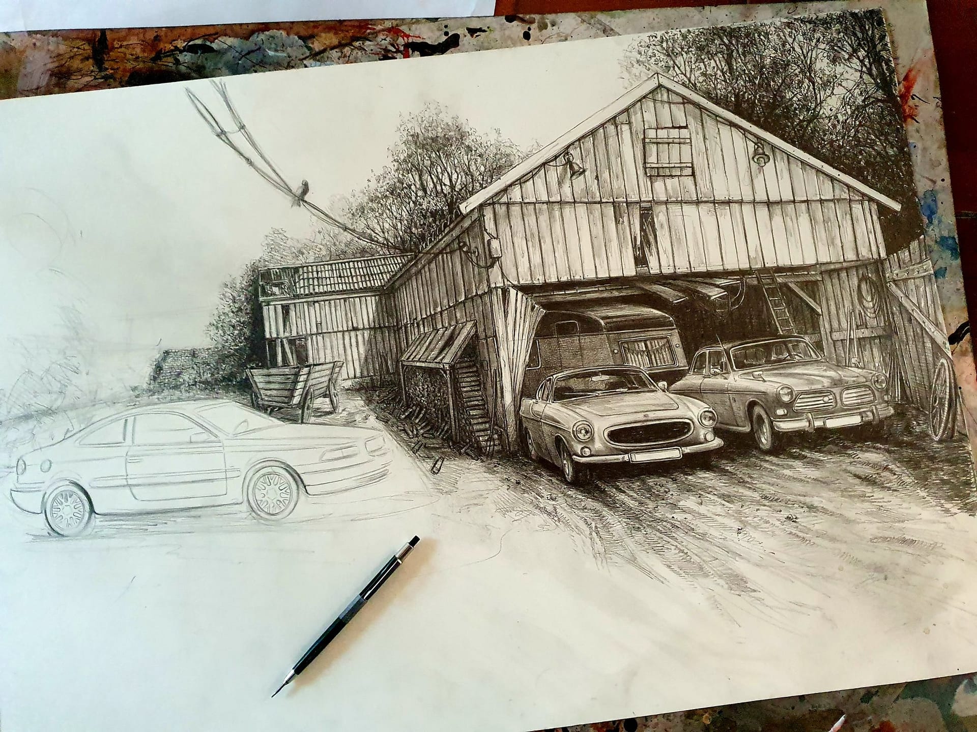 Die Pflicht bestand natürlich darin, die jeweiligen Autos mit meinen allzu typisch, vertrauten Mitteln, nachvollziehbar und gut erkennbar in Szene zu setzen – die Kür – um diese Auto Konstellation herum, eine glaubhafte, passende Szenerie zu „erfinden“, eine Art glücklichen, zufälligen „Scheunenfund“ anzudeuten. Am besten halbwegs passend zur bestehenden Lichtführung der Fotovorlage, somit Licht und Schatten nur geringfügig anpassen müssend. Dies war natürlich die große Herausforderung, aber auch gleichzeitig der eigentliche, wirkliche Spaß bei diesem großen Blatt. Gerne kann man hier Vorlage und Ergebnis miteinander vergleichen und vermutlich wird auffallen, dass am Ende die Katze, welche noch oben im letzten Step-Bild am unteren Bildrand erkennbar ist, dass finale Stadium der Zeichnung nicht mehr überlebt hat. Wenn mich ein Detail nervt, es der Komposition wider Erwarten sogar schadet, ja dann muss man auch mal bereit sein eine zusätzliche Idee der Bitterkeit des Radiergummis zu übertragen …