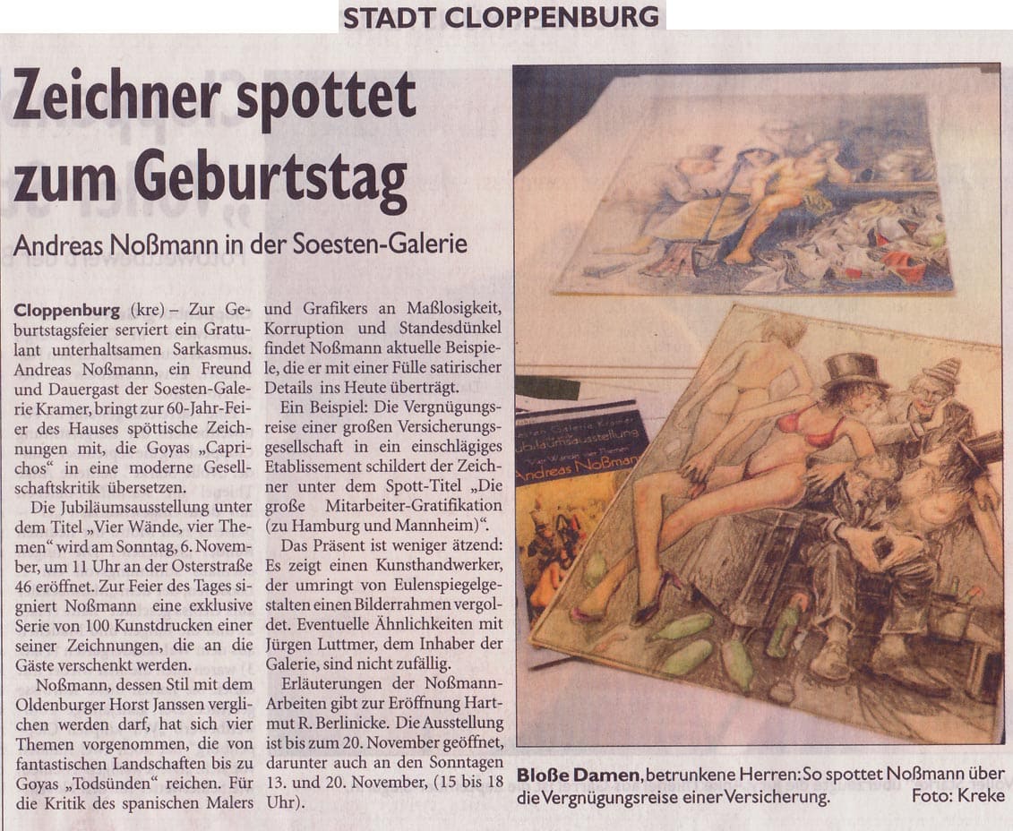 Zur Feier des Tages signiert Noßmann eine exklusive Serie von 100 Kunstdrucken einer seiner Zeichnungen, die an die Gäste verschenkt werden. Noßmann, dessen Stil mit dem Oldenburger Horst Janssen verglichen werden darf; hat sich vier Themen vorgenommen, die von fantastischen Landschaften bis zu Goyas „Todsünden“ reichen. Für die Kritik des spanischen Malers und Grafikers an Maßlosigkeit, Korruption und Standesdünkel findet Noßmann aktuelle Beispiele, die er mit einer Fülle satirischer Details ins Heute überträgt. Ein Beispiel: Die Vergnügungsreise einer großen Versicherungsgesellschaft in ein einschlägiges Etablissement schildert der Zeichner unter dem Spott-Titel „Die große Mitarbeiter-Gratifikation (zu Hamburg und Mannheim)“.